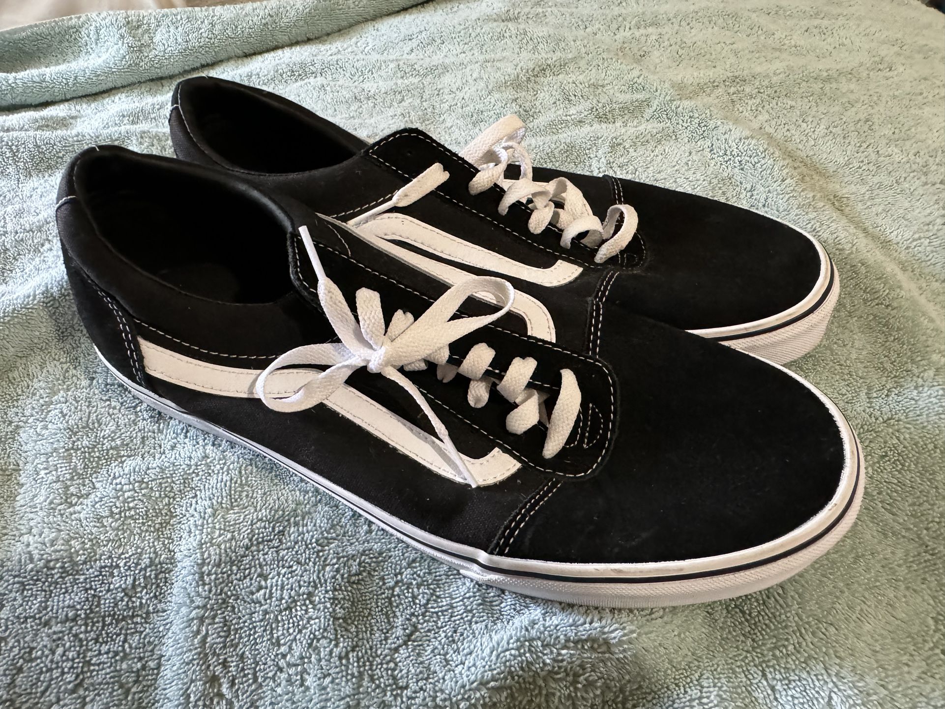 Worn once , like new reversed leather toe box and heel. Black with white . 20 bucks