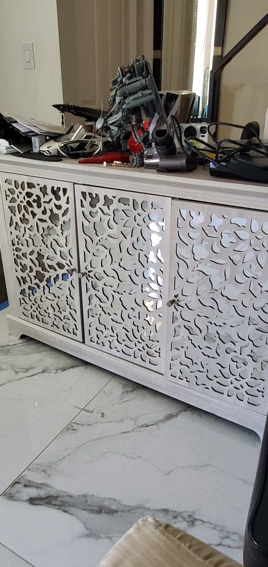New Condition. No need to assemble! Beutiful design with mirrored doors. Grayish in color. Beautiful as night stand too. Measurements in last picture. I'm remodeling and unfortunately color will not match. Dinning table, kitchen table, side tables, end tables, coffe table, night stand, chest of drawers, buffet cabinet, kitchen cabinet, garage cabinet, closet system, patio furniture, artificial plant, glass table, hallway table,accent chair, office desk, office cabinet, office chair, floor lamp, table lamp, chandelier, contemporary table, refrigerator, dishwasher, washer, dryer, kitchen cabinet, sofa, dresser, Ashley furniture, living spaces, Macy's, Macys, Toyota Tacoma, Honda civic, Honda crv, Honda Pilot, New, moving, queen bed, queen headboard, tween bed, tween headboard, bunkbed, wall mirror, bathroom vanity lights, table and chairs, barstools, contemporary, bookcase, microwave, TV cabinet, media cabinet, media shelf, ottoman, console.