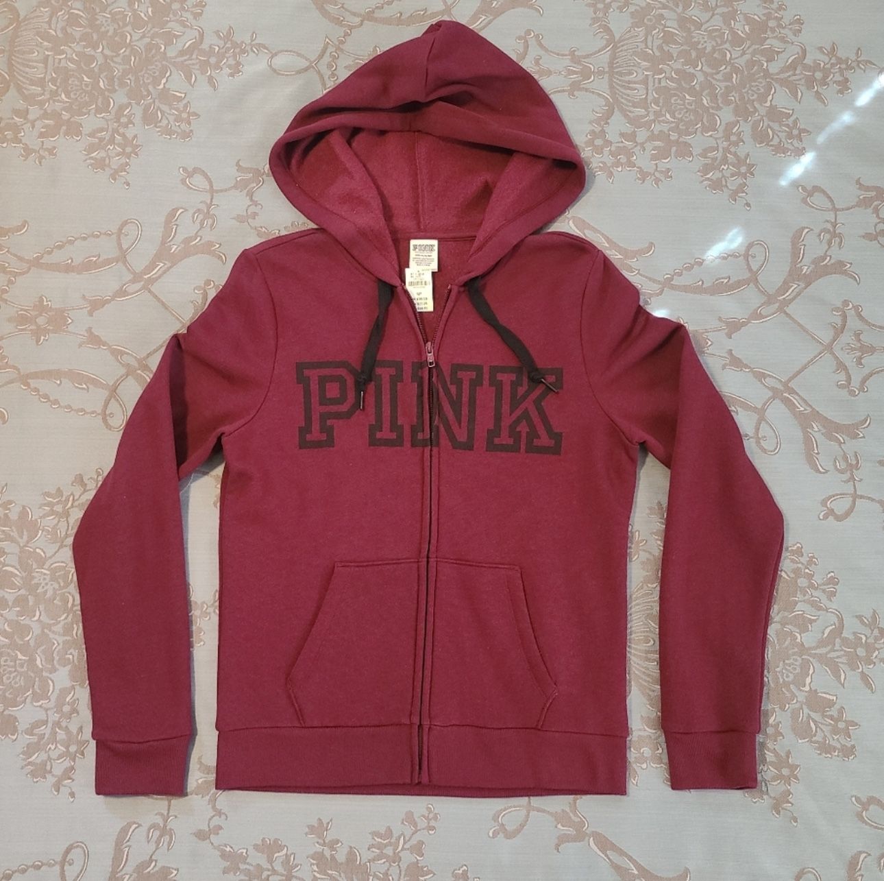 Brand: Victoria's Secret PINK Style: Full Zip Hoodie Color: Burgundy Condition: Brand new, with tags. See all pictures for details and measurements. Size: Small -Full Zip front closure -Two front pockets -Drawstring Hood -PINK spellout in black on chest $50