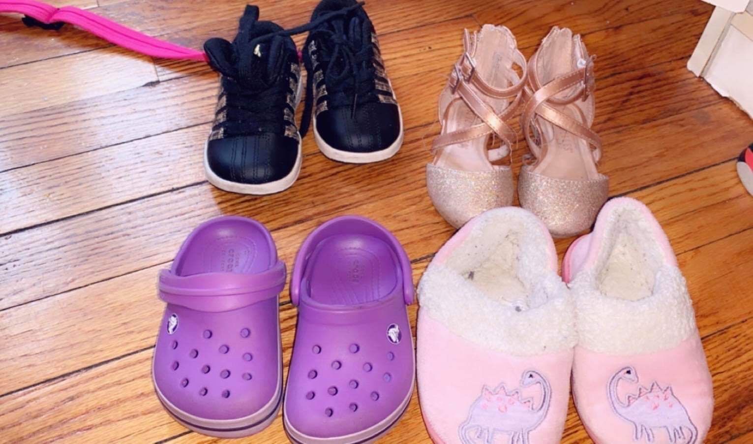 $20 for the purple crocs and the black shoes ! The flats and the dinosaur slippers FREE!! Lowest $15