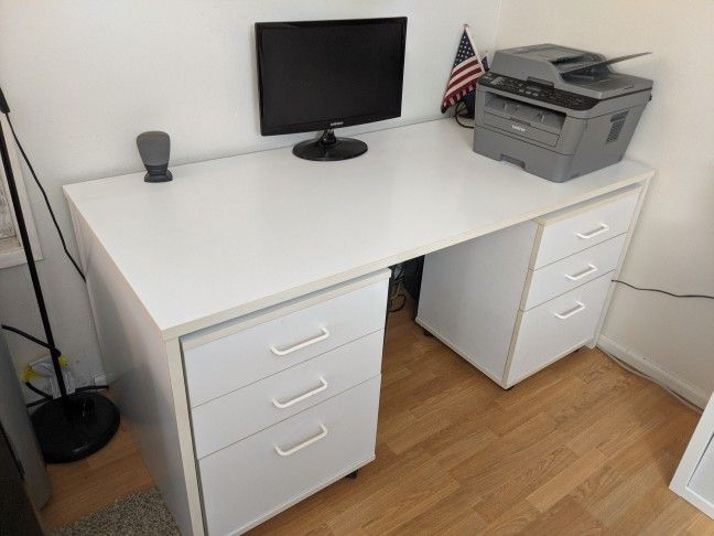 64" Computer desk with 2 wheeled cabinets in great condition. Awesome desk, great for home office, great to set a wide or 2-3 standard monitors. Wheeled cabinets are great to place printers on it if needed and move near by if have space.
