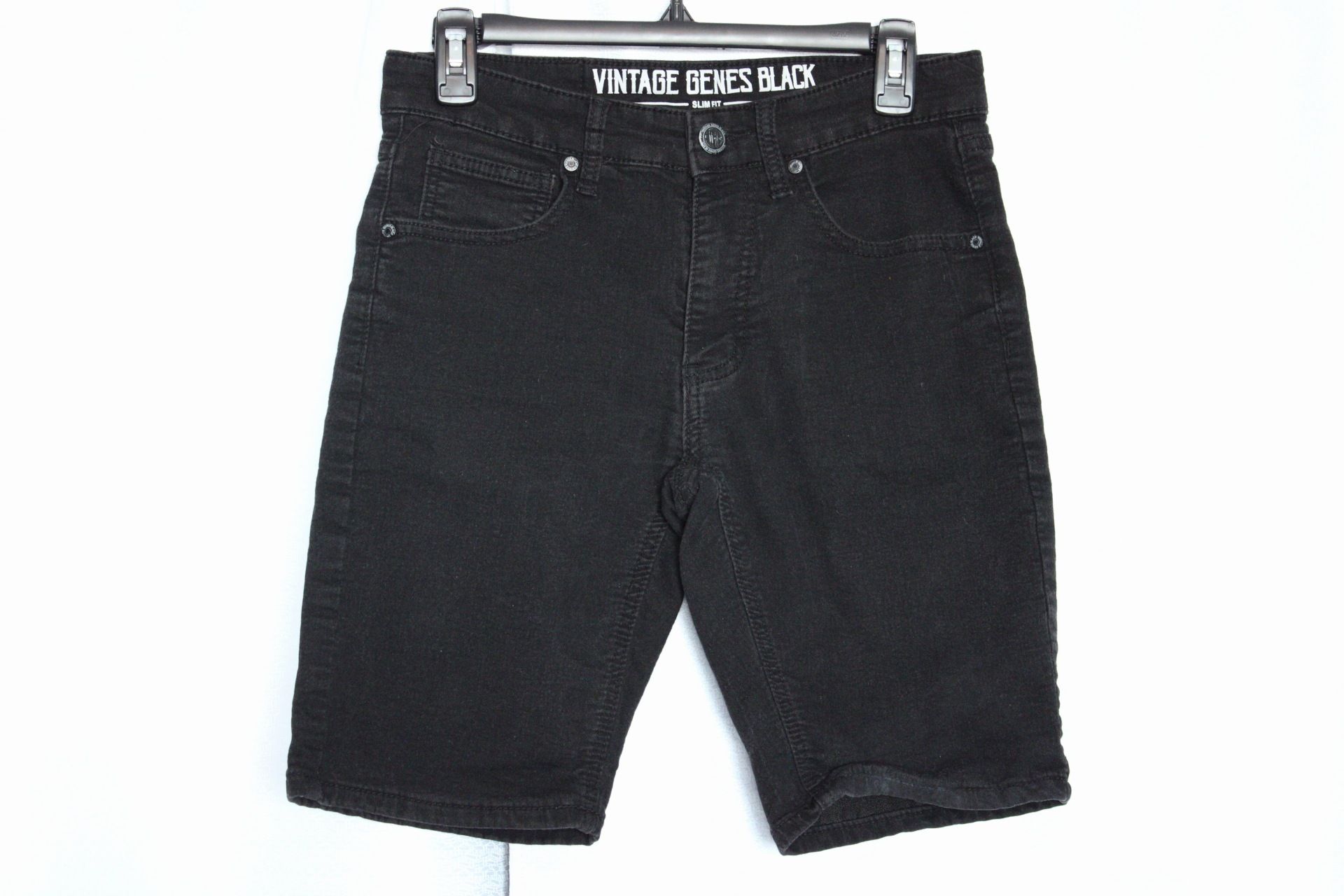 Preowned Vintage Genes black slim fit denim shorts, size W28. No stains or flaws. Classic everyday shorts with a modern slim silhouette. Features: • Black denim • Slim fit • 5-pocket design • Belt loops • Zip-button fly closure • Cotton blend with stretch Great staple piece for casual wear. Measurements (approx, laying flat): • Length: 18" • Waist: 15" (30" around)