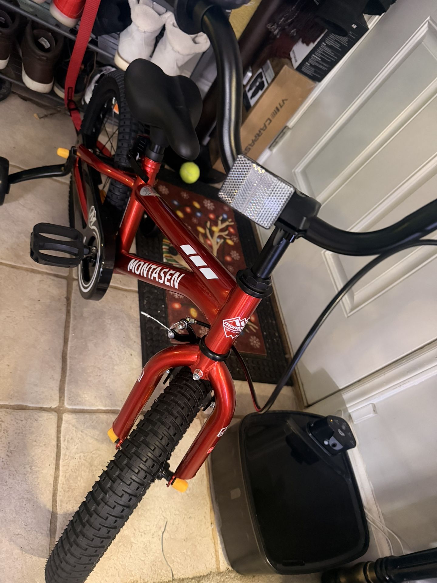 Brand New MONTASEN Kids Bike – Red – Assembled 2/18/2026 Brand new red MONTASEN kids bike, just assembled on 2/18/2026. Never ridden. Includes: • Removable training wheels • Bell • Detachable water bottle holder • Kickstand (for when training wheels come off) • Bike tire pump All items are brand new and included. Perfect for a beginner rider.