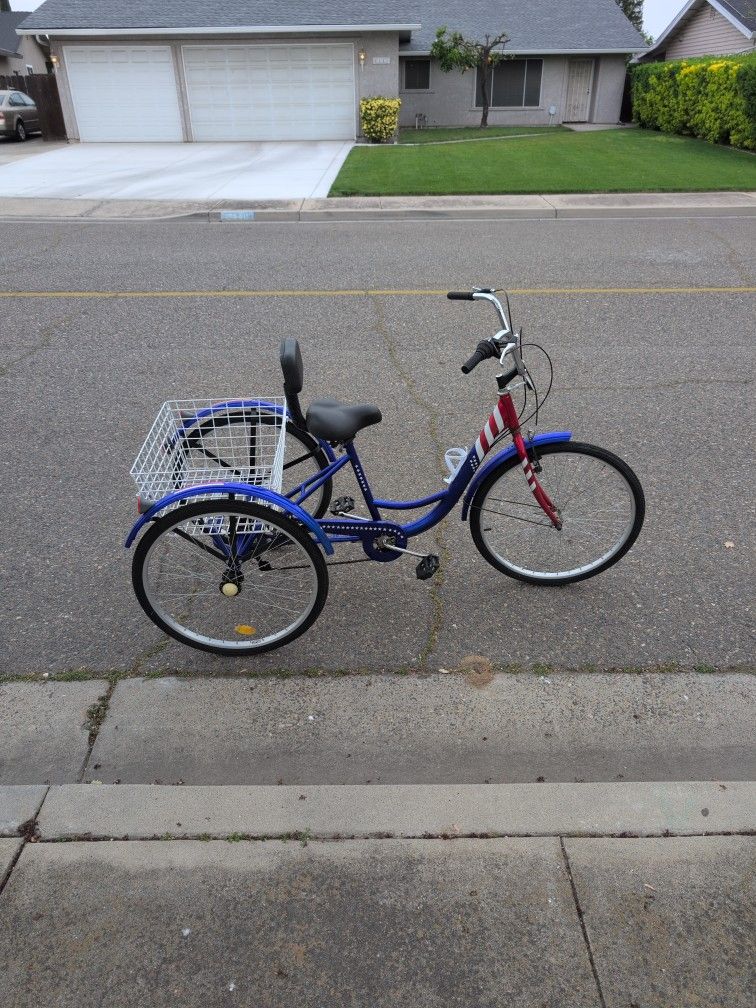 Three-wheel bicycle with gears and basket. Good overall condition. Some slight surface rust. Lately used and stored under the patio. See photos for exact condition. Pick up in Turlock near gear and tuolumne road