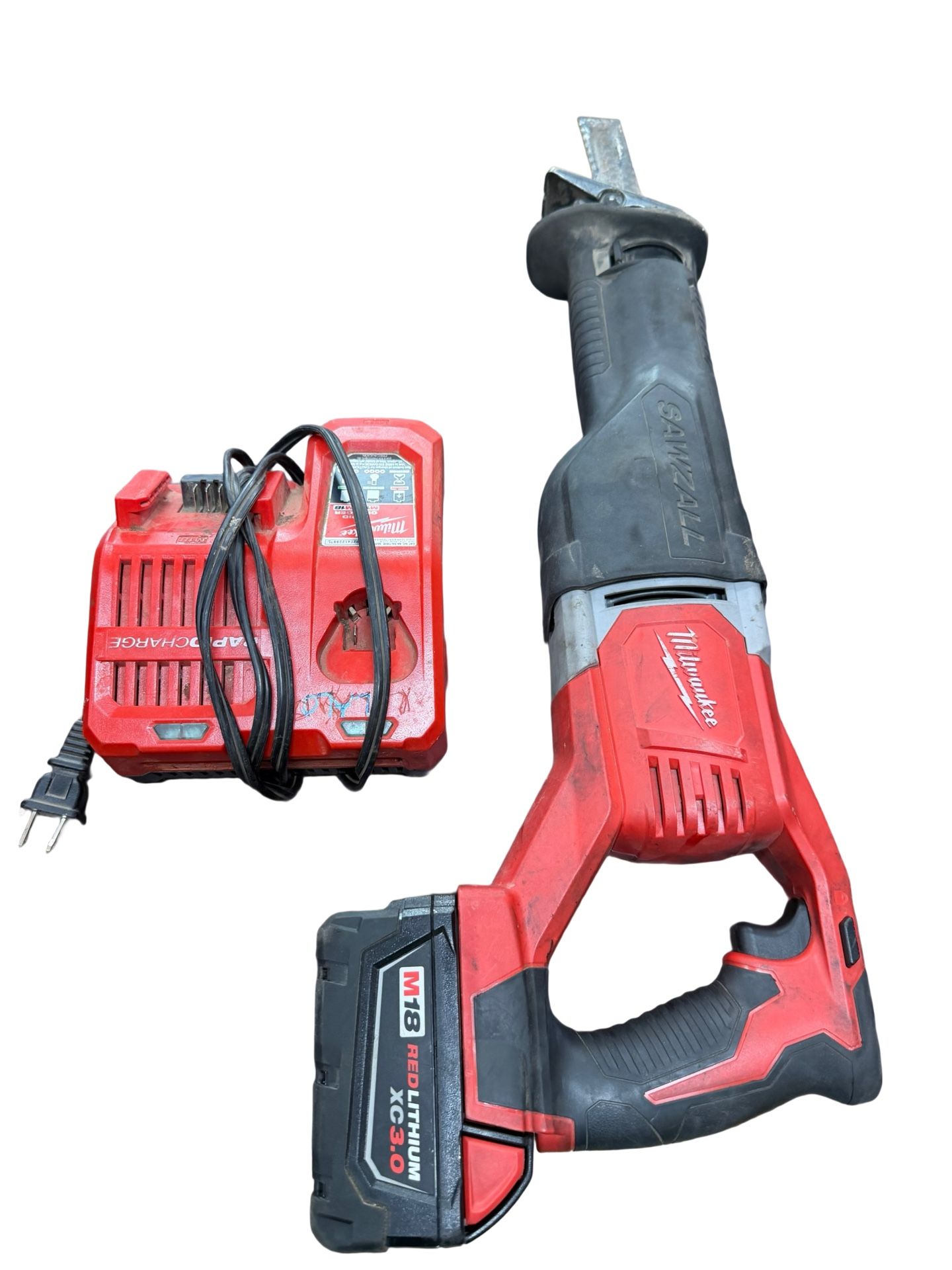 Here we have a MILWAUKEE 2621-20 M18 SAWZALL 18V CORDLESS RECIPROCATING SAW & 3.0 BATTERY. The cosmetic condition is good, works great. Comes with charger and battery. If interested call text or message us 747/253/1363