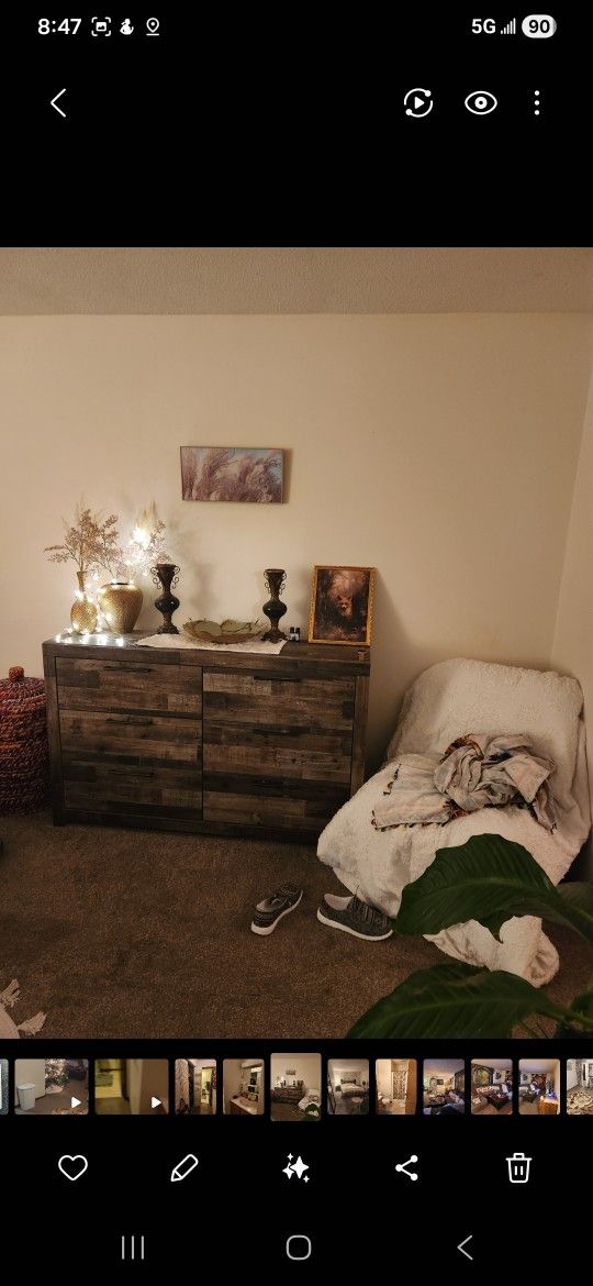 King size slat bed, dresser, and night stand. I have mattress with it. They're 2 large drawers at the foot of the bed.