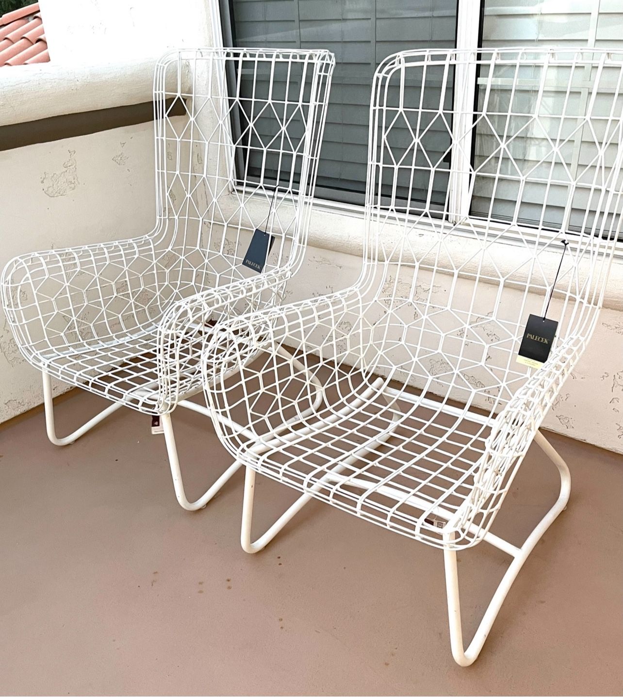These are the last two palecek chairs that were back stock from the bellagio hotel in Las vegas. Asking 325 EACH Metal with a white coating powder coat finish. Very modern palm springs style Palm Desert TAGS: Designer, staging, high end furnishings, outdoor furniture, patio furniture