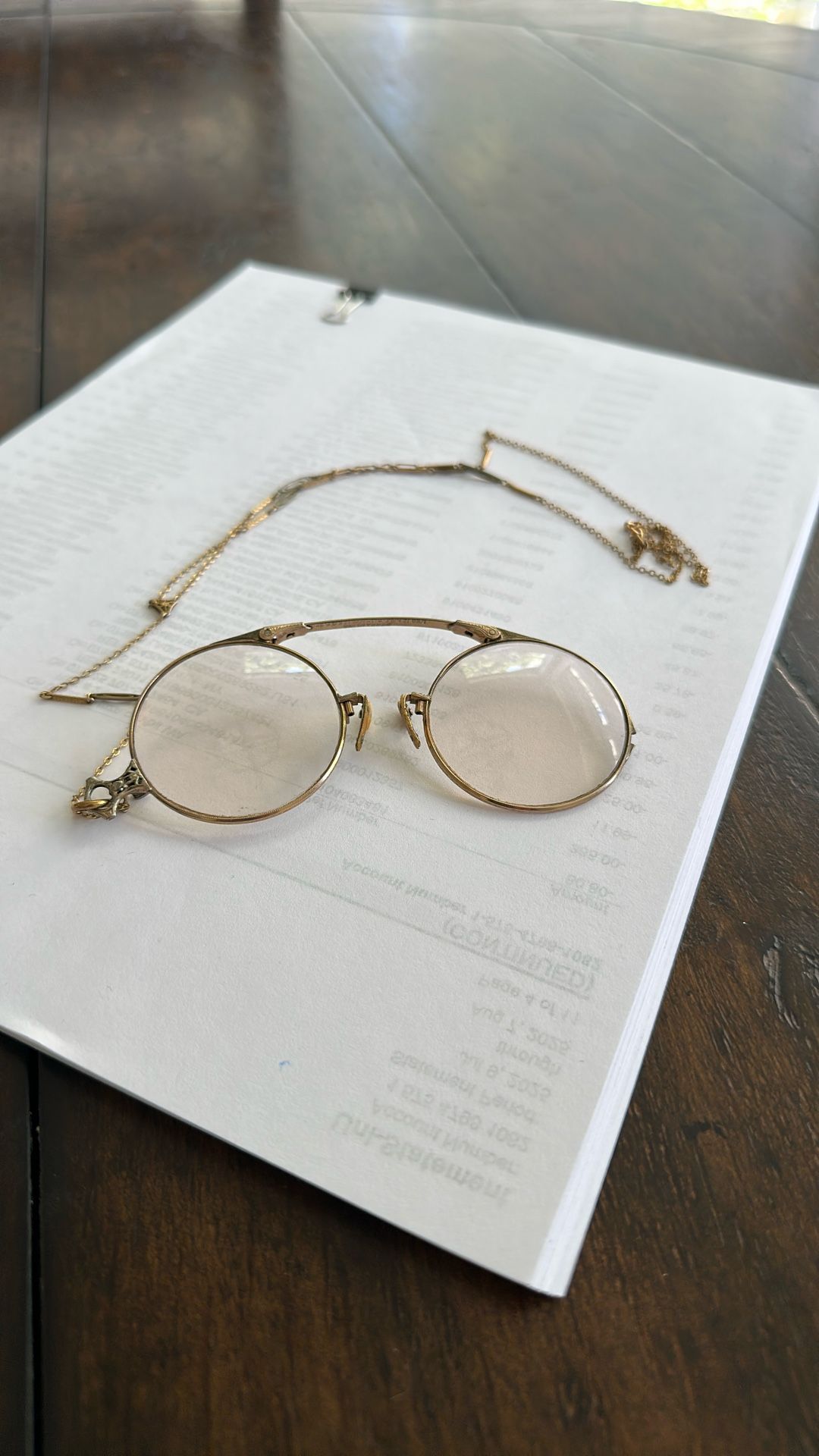 These antique pince-nez glasses feature a gold-colored metal frame with round lenses and a delicate chain attachment, presented in their original case. Style: Victorian or early 20th-century fashion. Needs chain repair on left side. Features: Designed to pinch the bridge of the nose rather than resting on ears. Usage: Often worn by collectors as vintage accessories or steampunk fashion items.