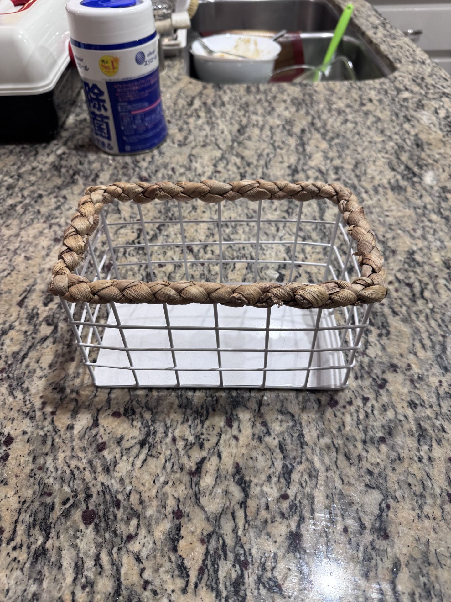 White Wire Storage Basket w/ Woven Rope Rim – Organizer Bin (8.5x5x4.5)