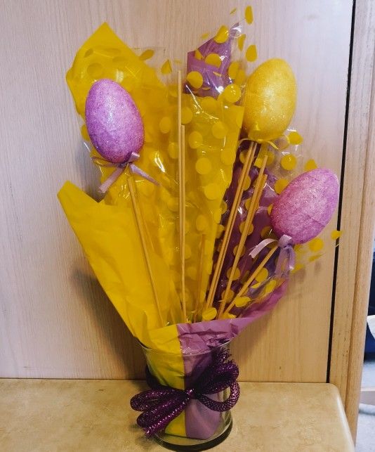 NOTE: Brighter yellow than appears in the pics. Used to tape wrapped candy to each of the wooden picks (see close-up image.) Makes a bouquet gift or a centerpiece. Measures 15" high. Clean condition from a smoke-free, pet-free home. Located in Stallion Mountain Golf Community, East Flamingo Rd
