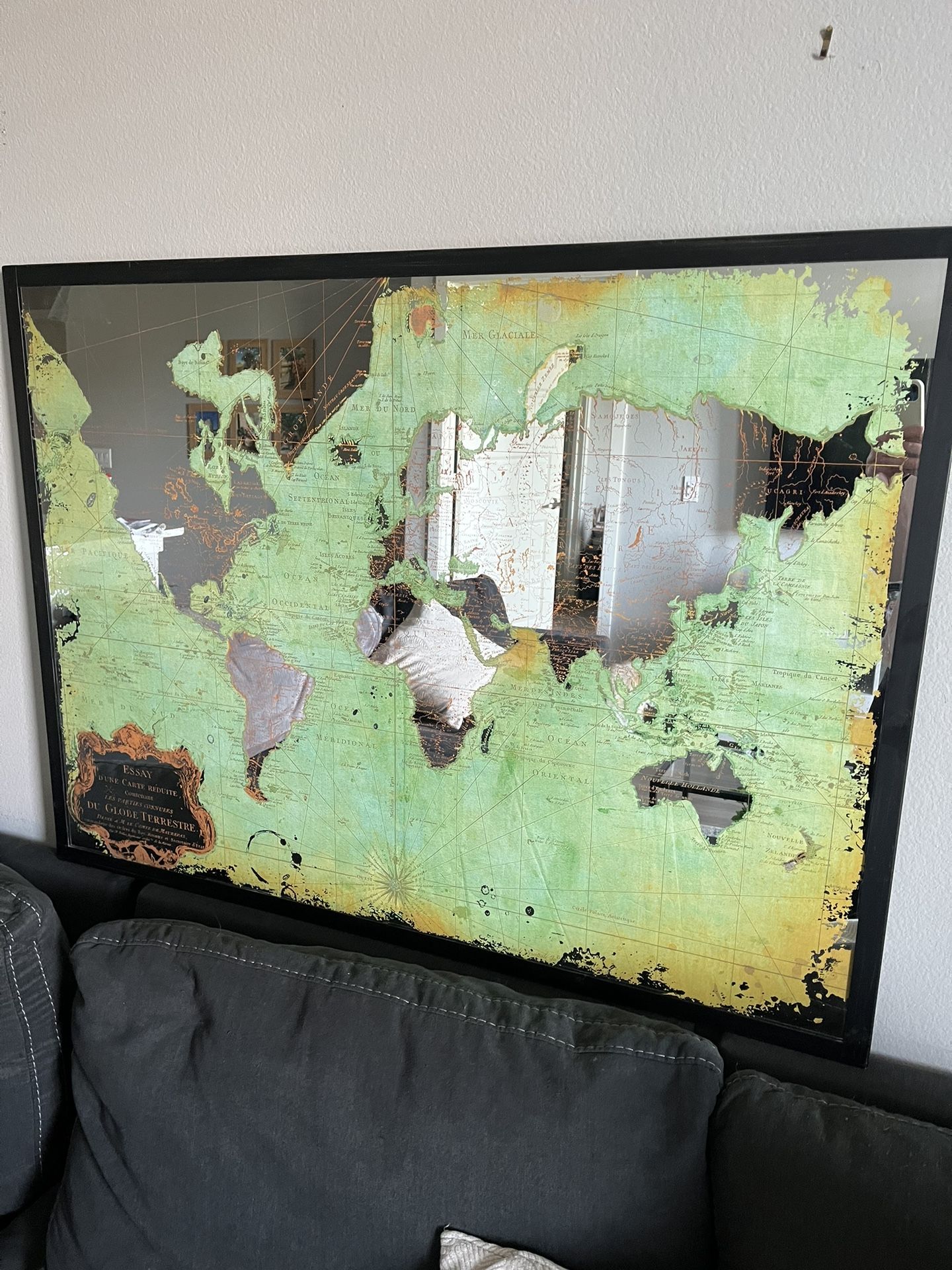 Great quality! Green mirrored world map art. Dimensions- 44.5in x 32.5in Pick up preferred. Will deliver for $20 extra within Austin proper