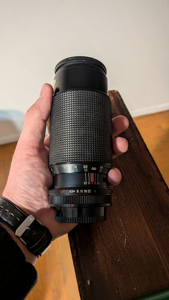 I'm selling a vintage 80-200mm f/4.5 telephoto lens with a Canon FD mount and built-in macro mode (1:4). The lens is in decent condition and comes with a Japanese Hoya protective filter and a rear lens cap. It's an excellent budget option for portraits with a pleasing "film-like" background blur or for creative experiments using an adapter.