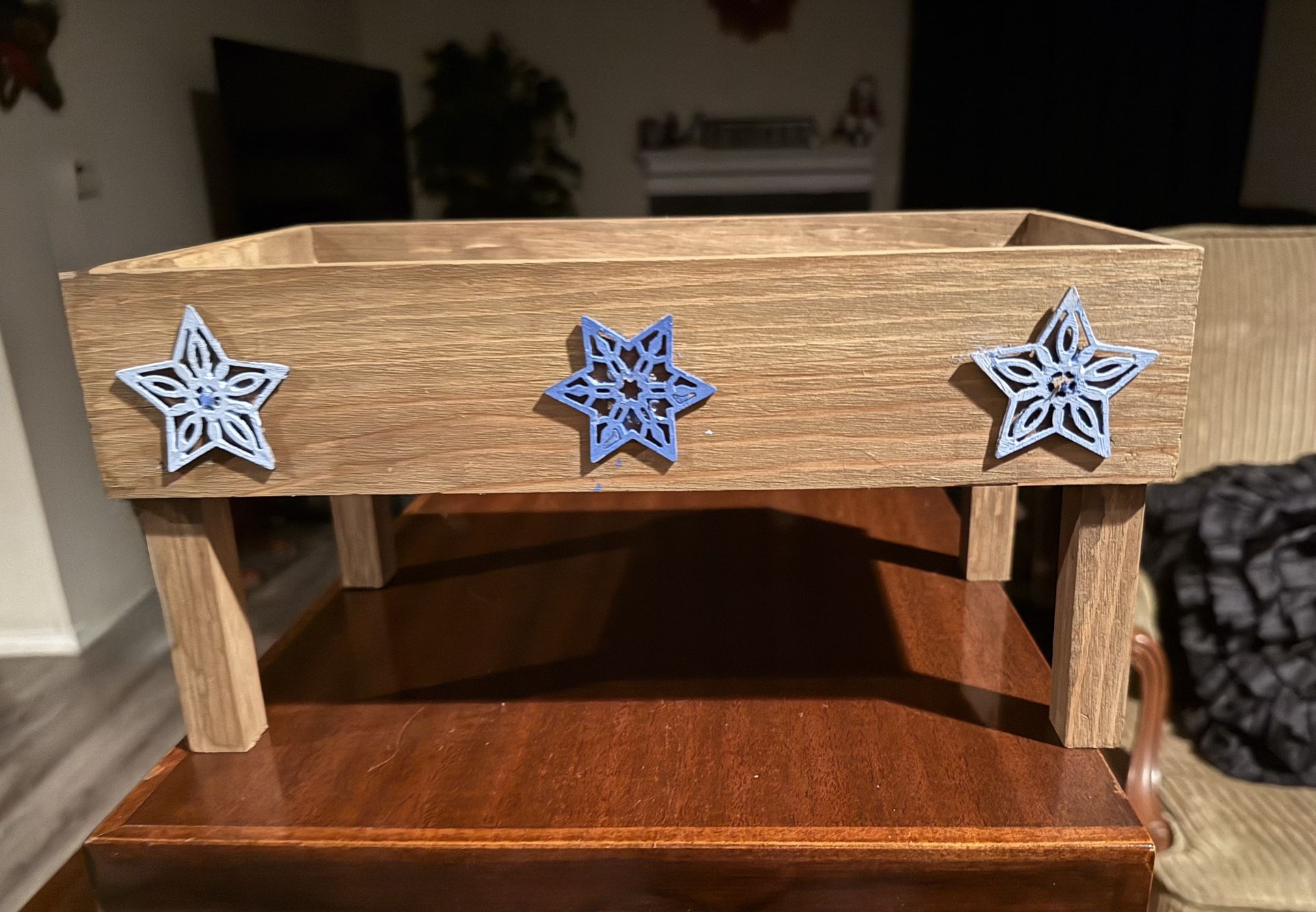 This wooden planter stand is perfect for showcasing your favorite plants or can be used as a decorative raised stand. The front side is adorned with three wooden stars in light blue and dark blue colors, The wood has a natural finish, highlighting the grain.