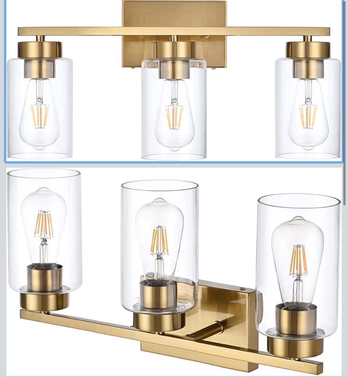 3-Light Bathroom Vanity Light, Modern Brushed Gold Wall Lights with Clear Glass Shades, Bathroom Wall Sconce Lamp for Mirror Living Room Bedroom Hallway *MISSING ONE GLASS COVER open box item. Asking $5 Must be willing to pick up. Located by Craig ranch park.