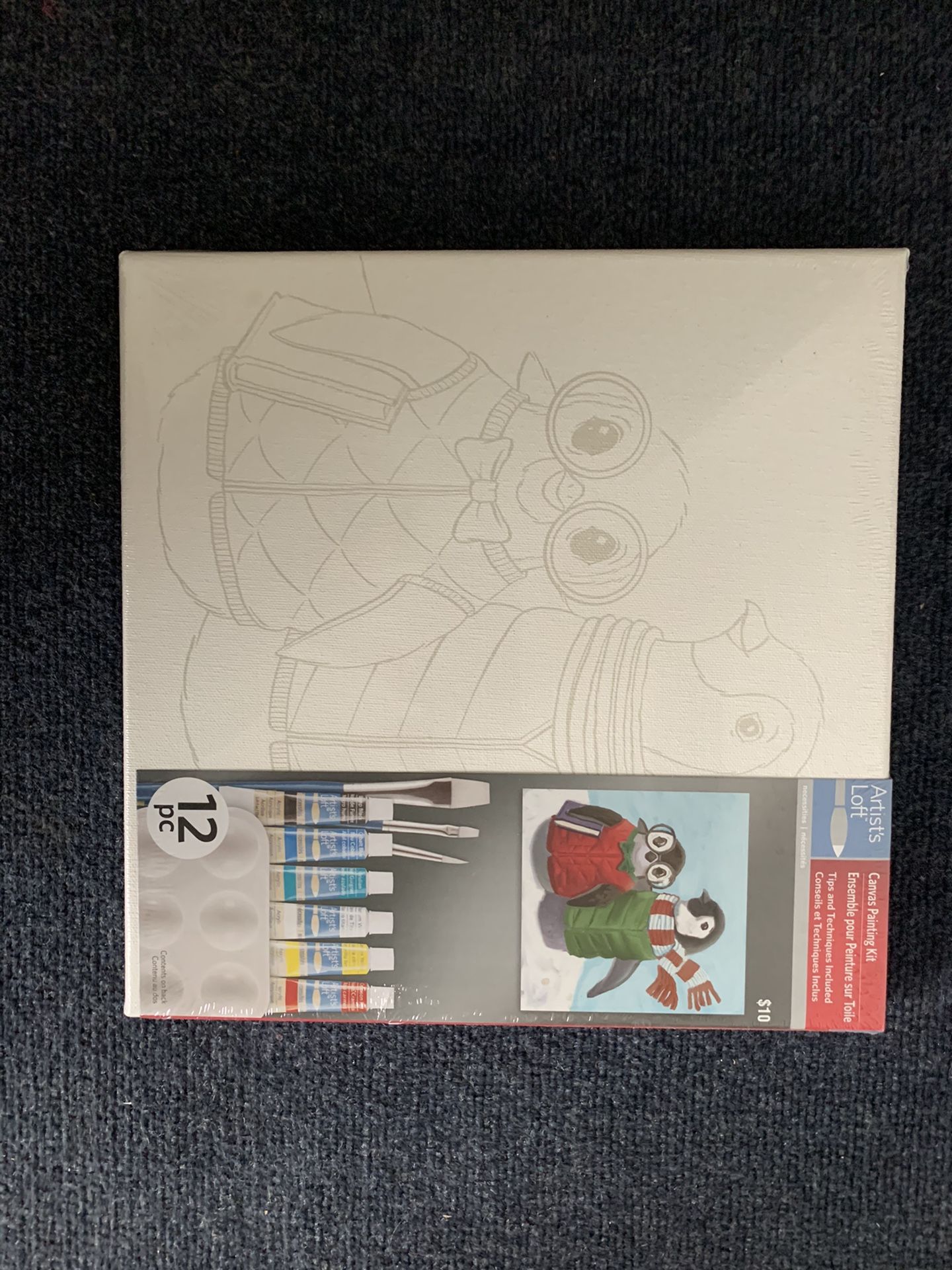 Cute art canvas with penguins. Never been used/opened. Retail price $10. Come with paint brushes and acrylic paint with paint tray. Great for ages 4-10.