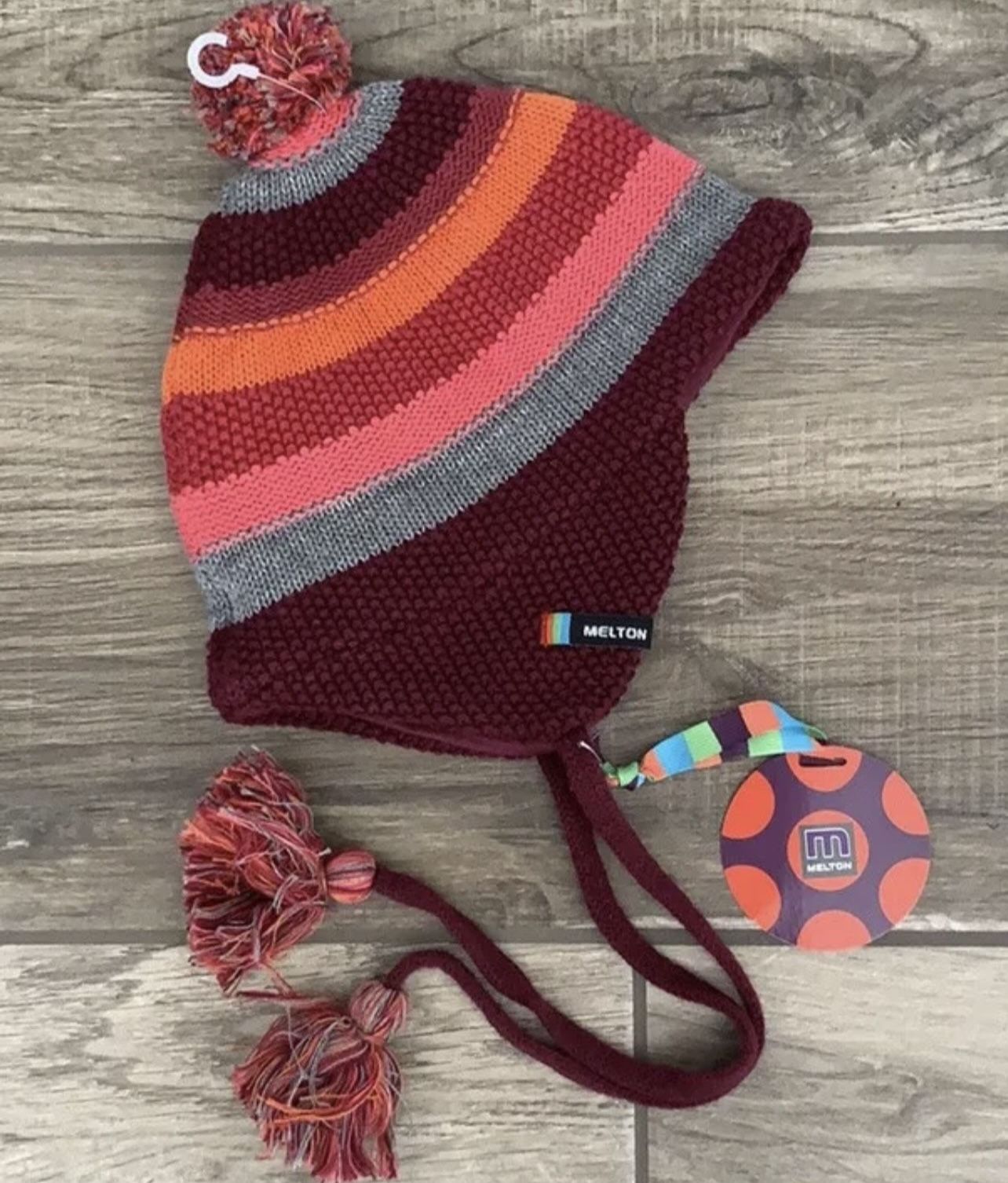 MELTON I mean seriously, is this the cutest baby winter hat you’ve ever seen or what?! Adorable striped beanie/flap hat. The tag says it is 9-12 months but honestly it’s more like 3-12 months. BRAND NEW WITH TAGS 😀FEEL FREE TO ASK QUESTIONS