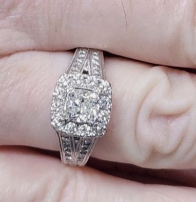 Natural diamond. 1.2 carat center stone, 2+ carats total. Selling $7,000 used online.