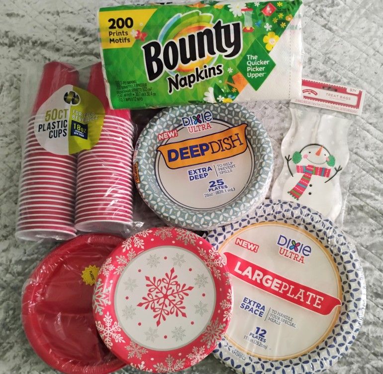 All brand new and sealed Bounty napkins 200 CT Red plastic cups 50 CT Dixie ultra deep dish 25 CT Dixie large platter plates 12 ct Snowflake plates 20 ct Plastic tray plates 16 CT 20 snowman treat bags All for $15 Public meetup location is on the map below in Riverview, or near USF (twice a week only) Delivery for $2-5 fee depending on location Cash preferred Hablo español