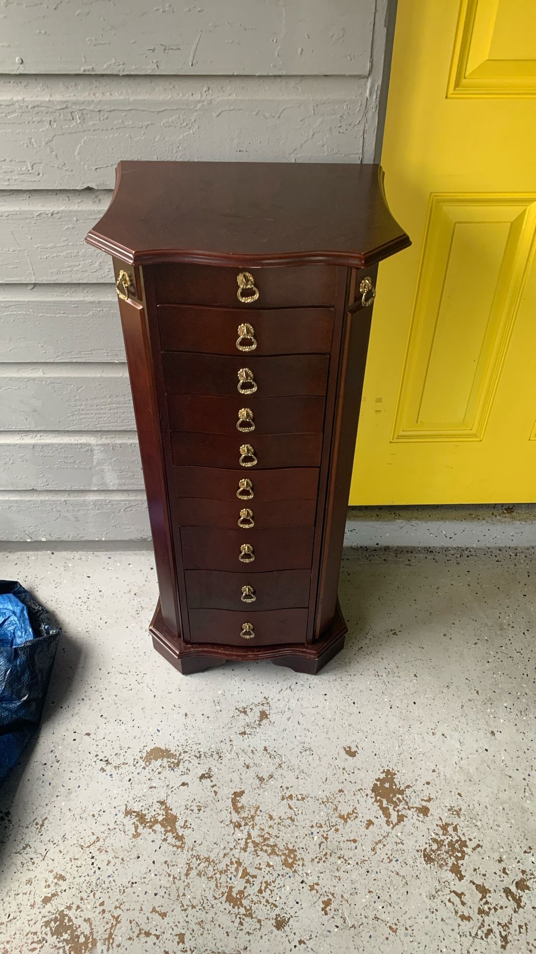 Mirrored top with ring storage. Small and medium sectioned drawers. Drawers for large objects with no divisions. Used. Comes with some items seen in drawer.