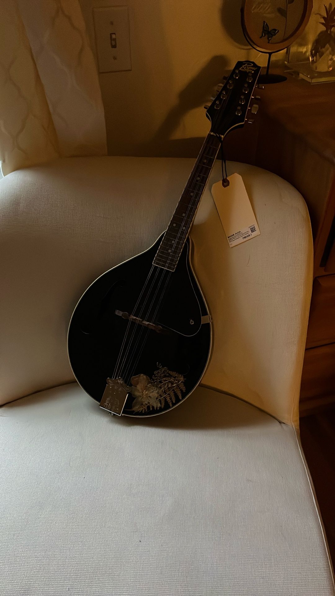 Good condition mandolin. It really hasn’t been used much I never ended up learning how to play it. It’s very unique with the dried flowers design on the lower part. These can go for over 100 I’m asking 75 obo!