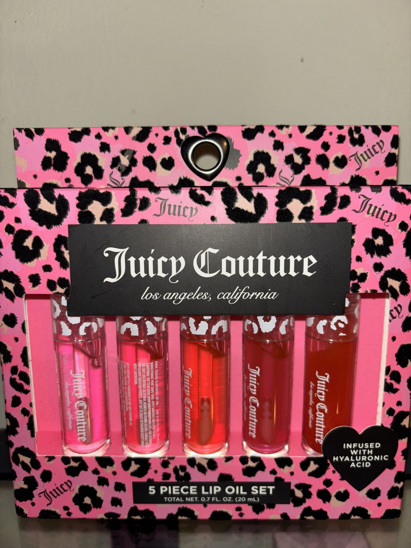 Juicy Couture 5 Piece Lip Gloss Oil Set Hyaluronic Acid Pink Leopard Gift Box