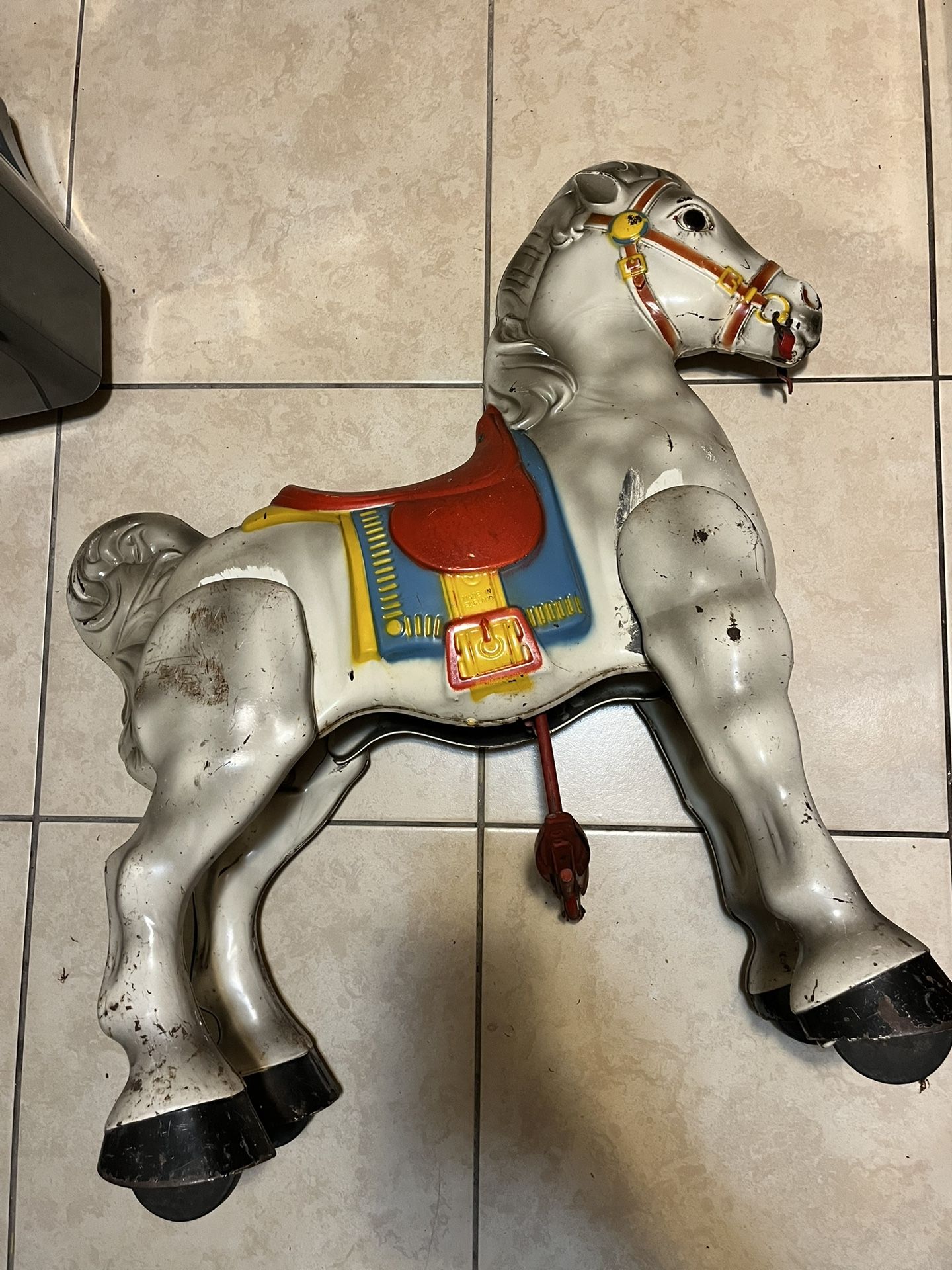 This is a vintage Mobo Bronco ride-on toy horse, manufactured by D. Sebel & Co. in England, likely from the 1950s. Original paint job still looks amazing and it works great!! The toy is made of painted, pressed steel with a lithographed tin body. It operates using a spring system where the rider pushes down on the stirrups to make the horse move forward in a trotting motion. "Magic Steering," introduced around 1950, allowed riders to steer by pushing on either stirrup. It was a very popular toy and remained in production until the early 1970s. This toy horse belonged to my grandmother as a kid. It’s in great condition considering its age. Still works great!! I’ve seen these listed online from about $500-$1,500 and mine is way better condition than all the others I’ve seen online!!. Only $140!! Any questions just let me know!!