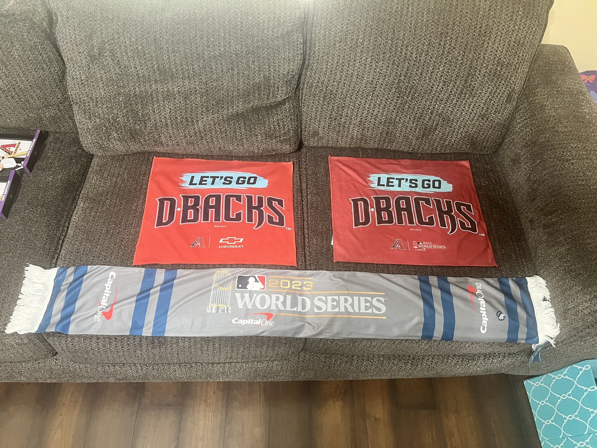 I have scarfs and rally towels from the 2021 World Series games at Chase field. Also have rally towels from the other playoff games as well. Only asking $5 for the scarfs and $2 for the rally towels. Just make me an offer. Please let me know if u are interested or have questions. Thank u.