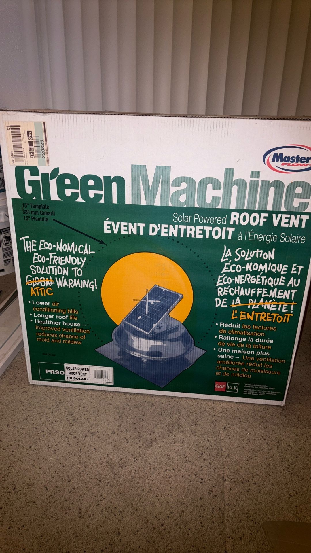 GAF solar powered attic vent, new in box. Put one on Dad’s house and he loved it, worked well! Basically half price of new as sold at HD. Not too bad to install but you’ll like to do it on a cool morning. 47 ave & Northern ave.
