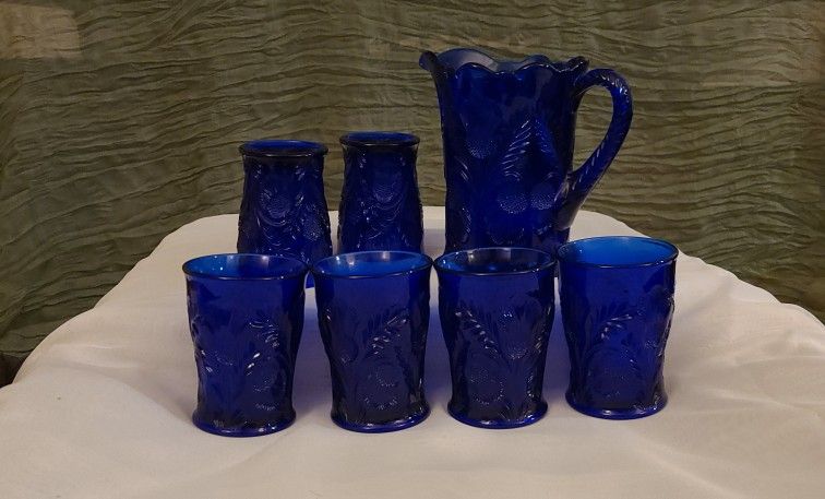 Beautiful cobalt blue Mosser glass pitcher with inverted thistle pattern. Measures 6.25 inches tall and 6.75 inches wide. Holds 24 ounces. In excellent condition with no chips, cracks. 5 cups also in great condition