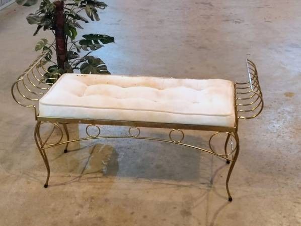 Will remove when unavailable. $85 In- Exact -Cash _ Cash Sale. $85 Firm. ~ See 8-7:45 any day.~ -Pick Up NW 30TH- George Koch Sons vintage art deco great Hollywood regency iron sitting arm bench with curved, circular, slotted detailing. Heavy duty protective rubber tips on the feet. The gold has tarnished areas, leave with tarnish look or refinish, the upholstery needs replaced it has a hole and stains. 45" at the outside of the arms, 36" long on the seating area, seat cushion 19" high, seat base 16.5" high, 16" deep front to back. The first layer of wood beneath the bench has water stains and breakage, I didn't want to break it away because it displays your maker label. ~ NW OKC. If price isn't a fit for you please do not inquire|Meet!* * Please no holds!~