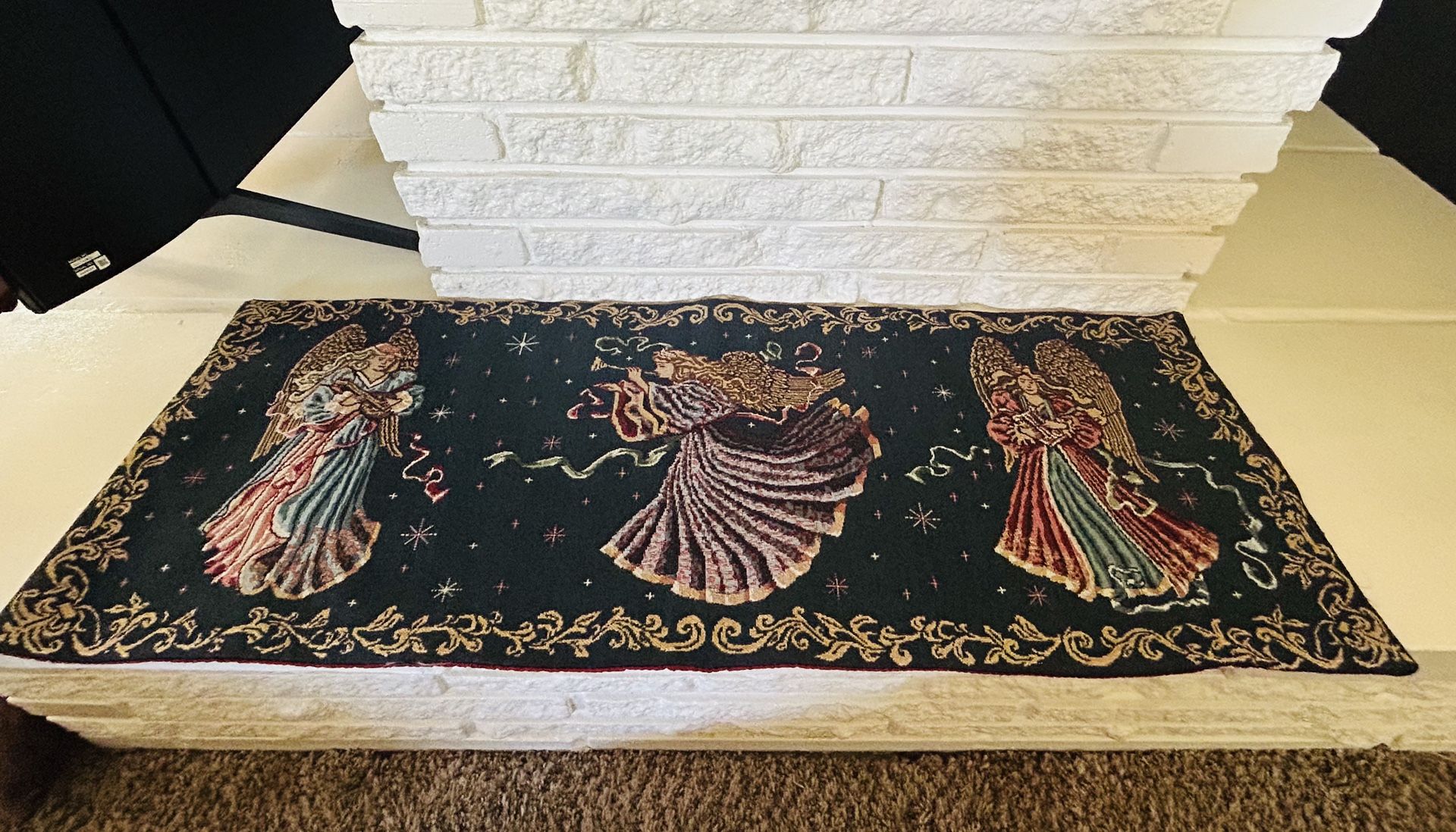 This vintage tapestry table runner features intricate patterns of angels in multicolored . Its rectangular shape measures 36 inches in length and 13 inches in width, making it a perfect addition to any table setting. The table runner is made of high-quality material and has a beautiful Victorian style, making it a great piece for Christmas occasions. In addition, the table runner has a lining and can be personalized if desired. Whether you're hosting a party or simply looking for a stylish addition to your home decor, this table runner is a must-have. It is a perfect blend of elegance and functionality that is sure to impress your guests. PLZ SEE MY ALL ONLINE ITEMS