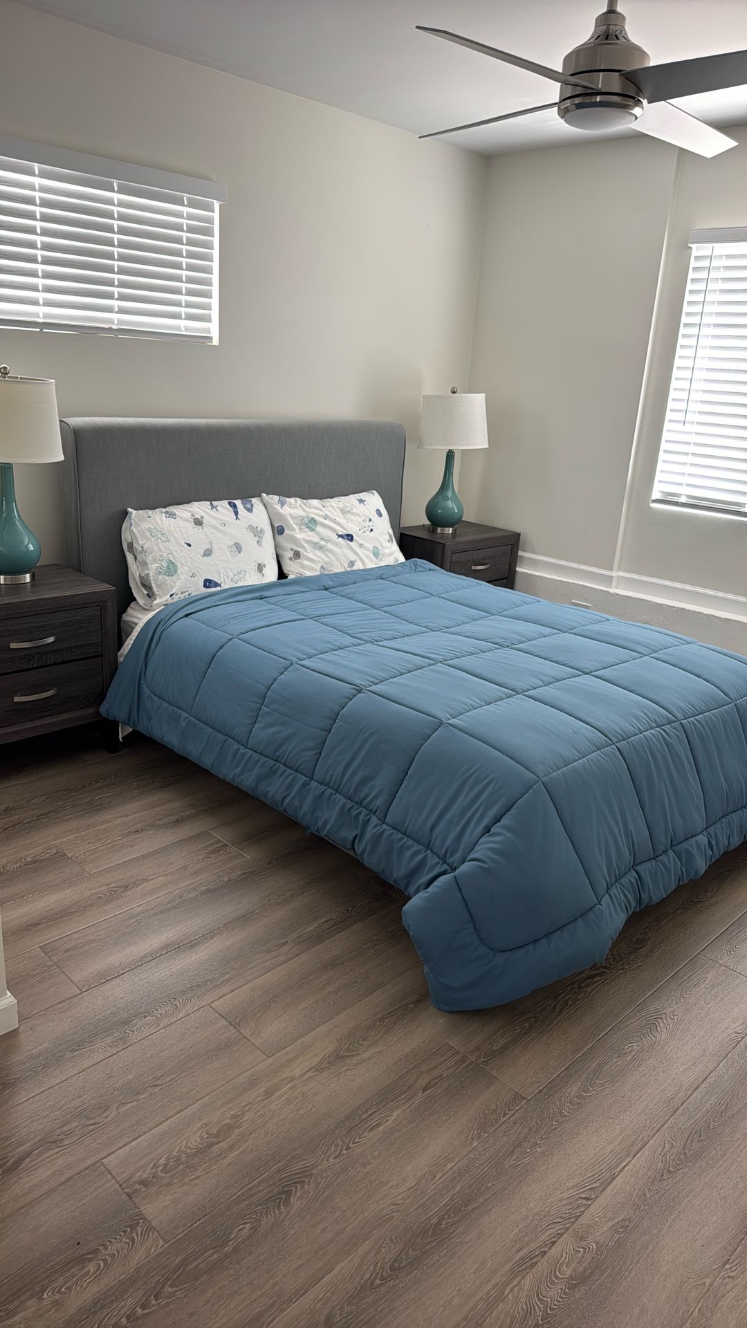 This is a queen bed with frame, box spring, and mattress. The nightstands are 24” x 16.5” with two drawers in each. Two lamps included. This is an entire bedroom ready to go!