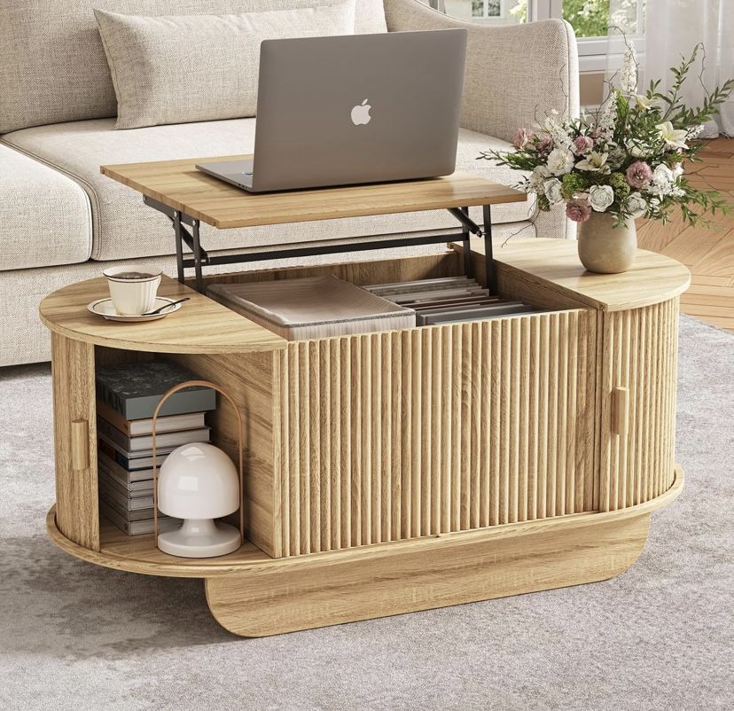 Lift Top Coffee Table with Storage,Oval Wood Coffee Table with Sliding Doors & Hidden Compartment, Fluted Center Table for Home,Living Room,Office, Na