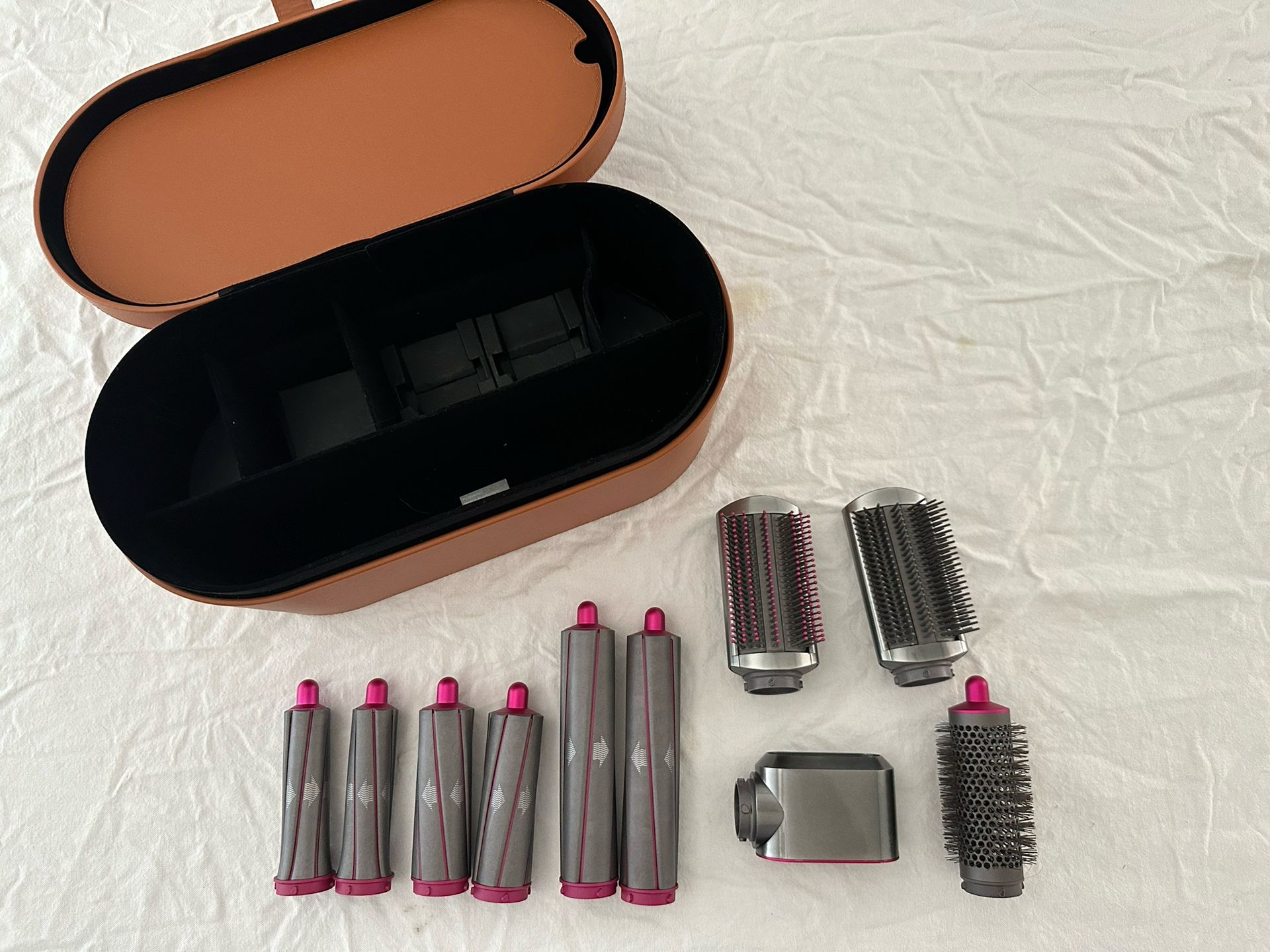 Excellent condition Dyson Airwrap accessories only. Includes: 1.2 inch long barrels 1.2 and 1.6 inch standard barrels Round volumizing brush Pre-styling dryer Soft smoothing brush Firm smoothing brush Dyson brown leather box