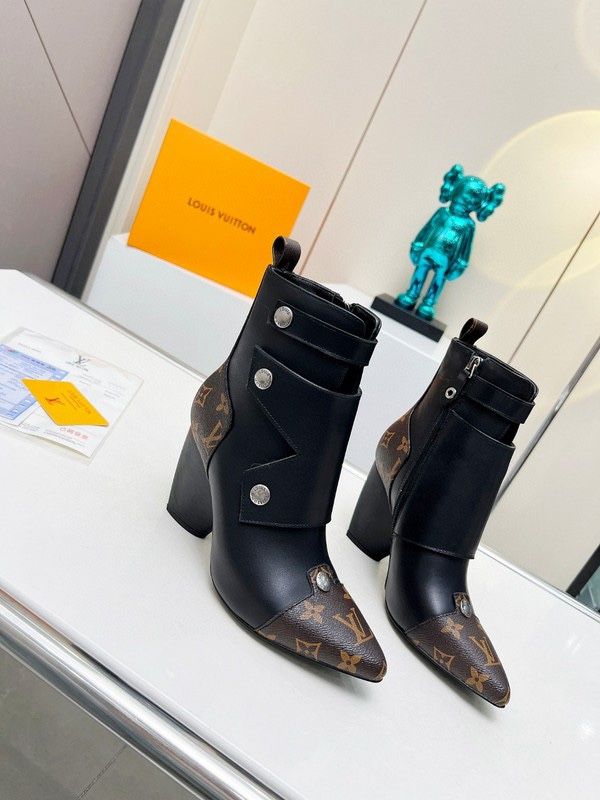 Louis Vuitton ankle boots, featuring the brand’s signature monogram pattern on the pointed toe and heel areas. The design combines classic black leather with the iconic LV brown monogram canvas, and the boots also feature a block heel and side zipper closure. This type of footwear is typically from one of Louis Vuitton’s luxury collections.