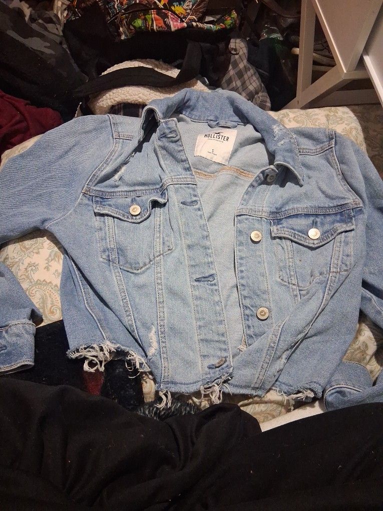Add a touch of vintage flair to your wardrobe with this classic Hollister Co. distressed denim jacket! This stylish piece is a perfect year-round layering essential. It features a trendy light-to-medium blue wash, full button-front closure, and intentional distressing for that perfect lived-in look. The frayed, raw hem adds to its casual appeal. Key Features & Details: Brand: Hollister Co. Size: S (Small) - As seen on the interior tag. Color: Light-to-medium blue wash Style: Distressed Trucker Jacket, Raw Hem, Button Front