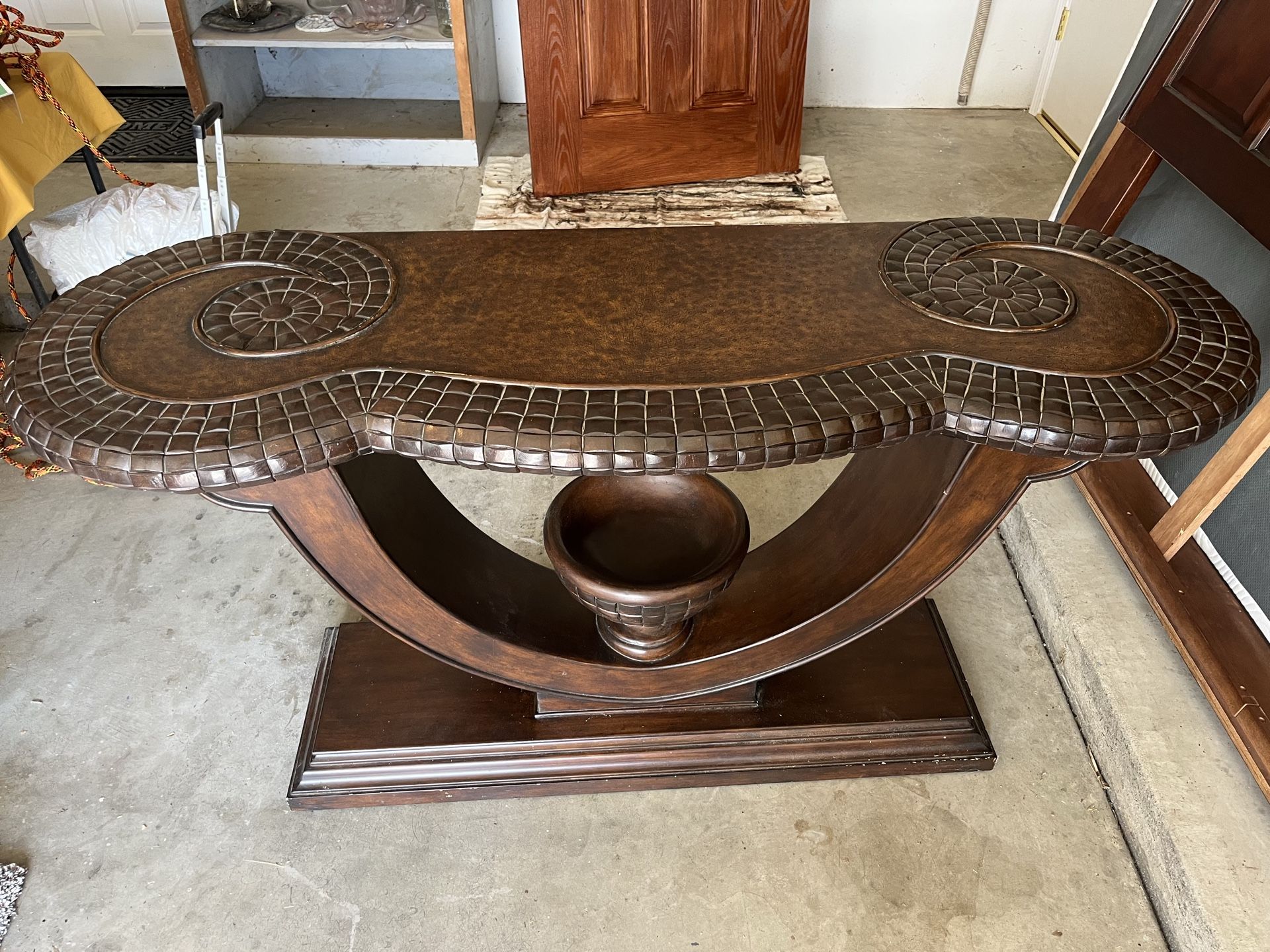 Beautiful and unique carved wood console table with a sculptural design. Features intricate swirl detailing on both ends, a rich dark wood finish, and a solid, sturdy base. Includes a decorative center bowl accent underneath. Perfect as a sofa table, entryway table, or statement piece—definitely a conversation starter. Condition: Good condition. Solid and well-made with minor wear consistent with use. Pickup Haggin Oaks 57 1/2” length x 20” width 32” height