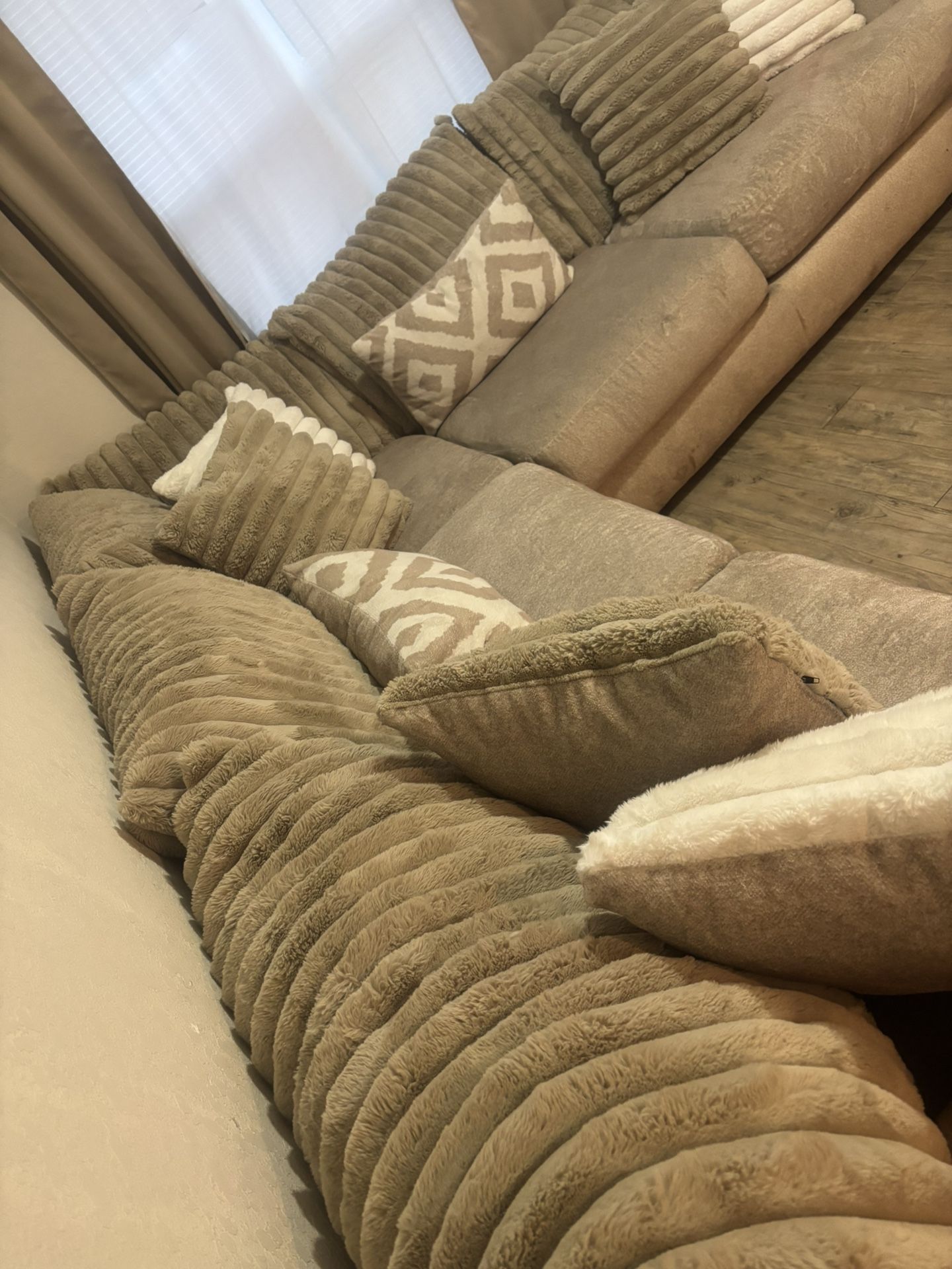 This sectional is in excellent condition and can be easily cleaned - the pillow cases and covers are machine washable and dryable. The fabric is incredibly soft and fluffy, making it very comfortable. Please note that there's a small split in the cushion fabric, but it can be easily repaired with some thread. *Please note: Pickup only, no delivery options available.*