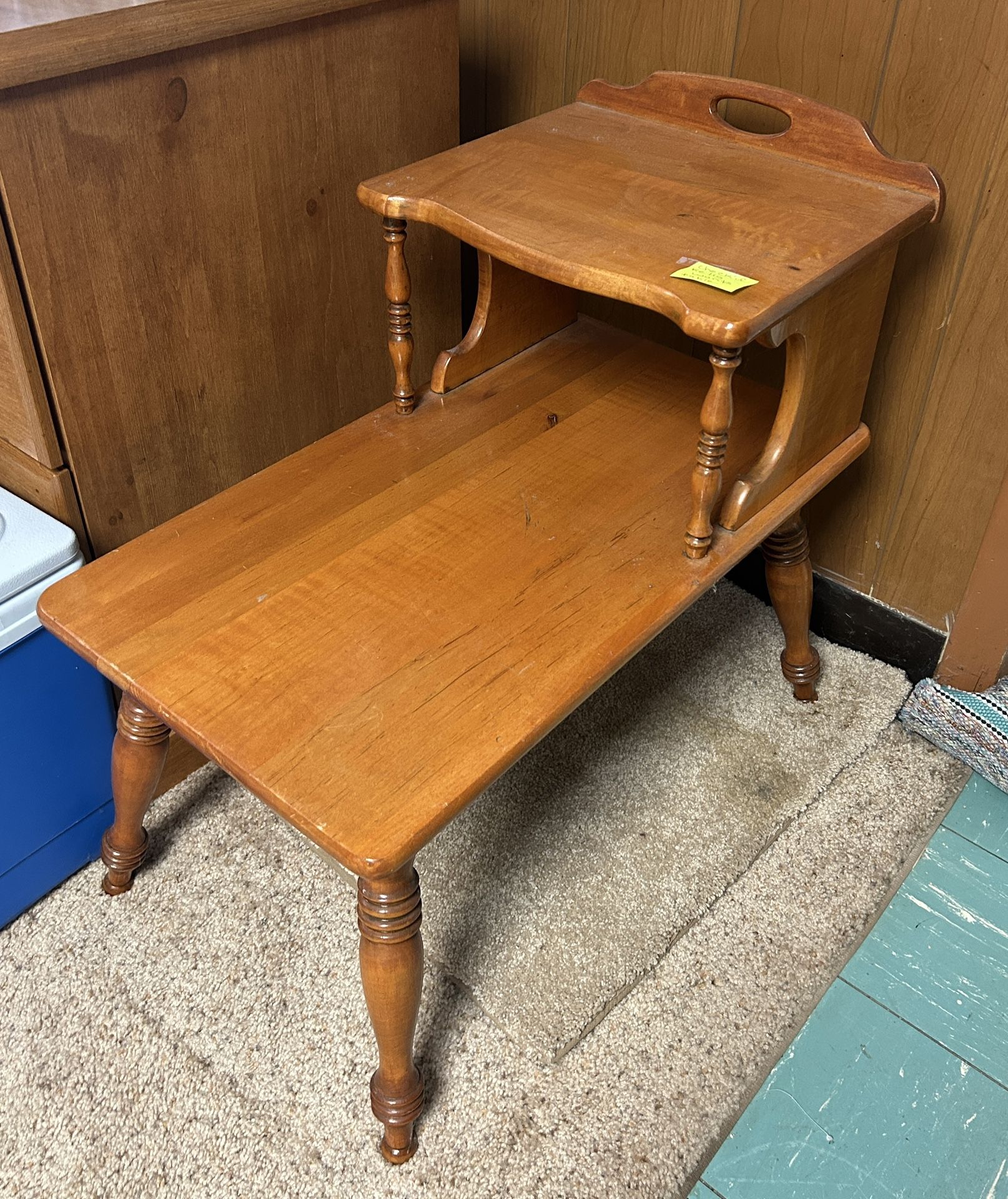 Vintage Mid-Century Maple Wood Two-Tiered Step End/Side Table Often used for lamps on the top tier and books or decor on the lower tier. Cash only. Approximate Measurements Total Length of bottom (measuring legs) - 26 inches Total width of bottom (measuring legs) - 15 inches Bottom shelf length - 25.75 inches Width of bottom shelf - 15 inches Height from ground to top of bottom shelf - 14.5 inches Height from top of bottom shelf to top of top shelf - 8.75 inches Length of top shelf - 12.5 inches Width of top shelf - 15.25 inches Total height from ground to top of handle thing on the back - 15 inches