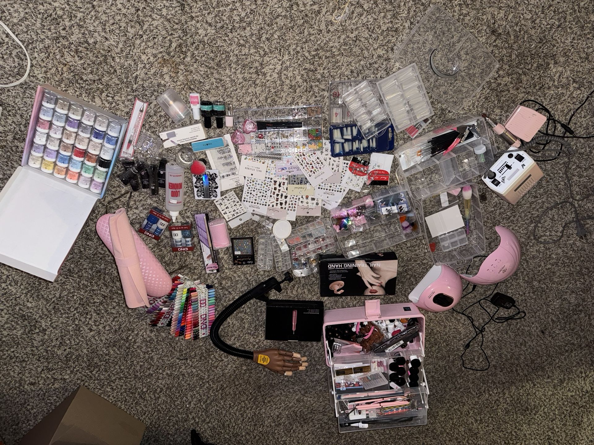 Barely used nail supplies. Some of it hasn’t even been used. Really great for beginners. Ranging from brushes, charms, stickers, acrylic, as well as practice hand. Drill. Bits. 2 lamps. Nail polishes. Dotting tools, super fine brushes. Many types of rhinestones with glue. Comes with a couple of organization boxes as well.