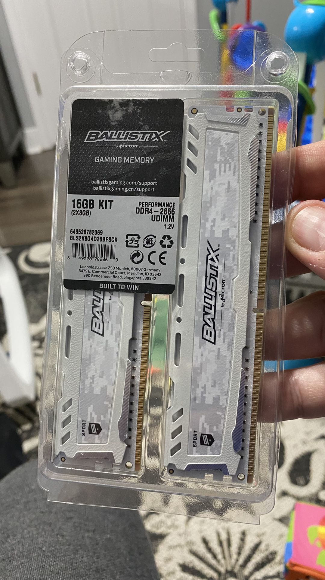 Hello You are looking at a pair of Crucial Ballistix gaming RAM cards model BLS2K8G4D26BFSCK. This is a 16GB Kit consisting of (2) 8GB DDR4 single rank desktop modules that operates at speeds up to 2666 MT/s and has a CL16 latency. It is an Unbuffered DIMM. It conforms to the industry standard DDR4 UDIMM layout of 288 pins and is compatible with systems that take DDR4 2666MT/s UDIMM memory • Faster speeds and responsiveness than standard DDR4 memory • Ideal for gamers and performance enthusiasts • Intel XMP 2.0 profiles for easy configuration • Digital camo heat spreader in white Local pickup only at sellers discretion. Asking $100 or best offer, thank you for viewing!!!