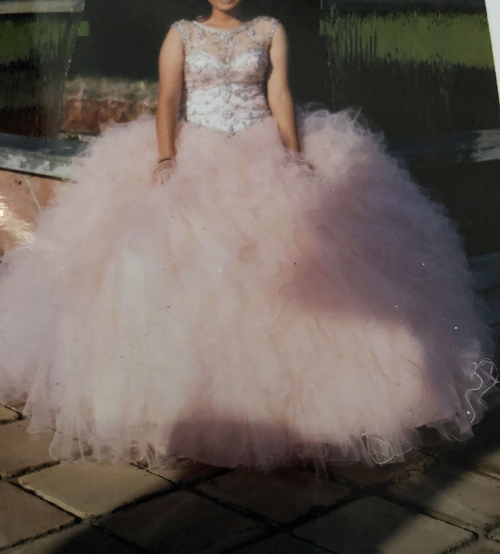 Blush pink haltertop dress with corset lace up in the back, with sequence on front and dress SIZE 12 used once just for the day paid $975 have receipt to prove asking $500 obo can send more pics of interested