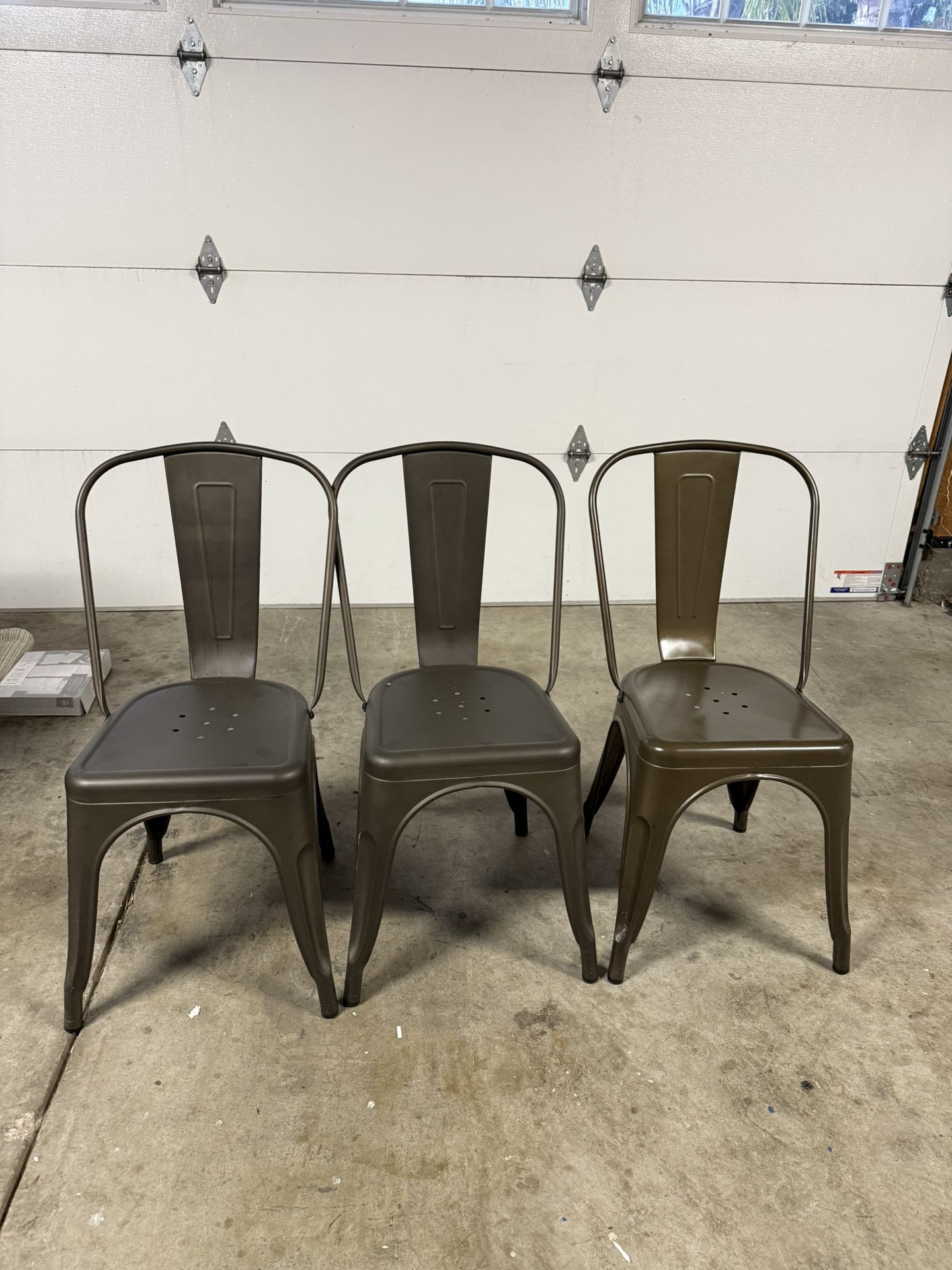 There are 3 dining chairs available, $15 each. The color is like gunmetal bronze. Please note that the far right is shiny compared to others that are matte. Take 1,2, or 3. Pick up south San Jose, near Snell Ave.