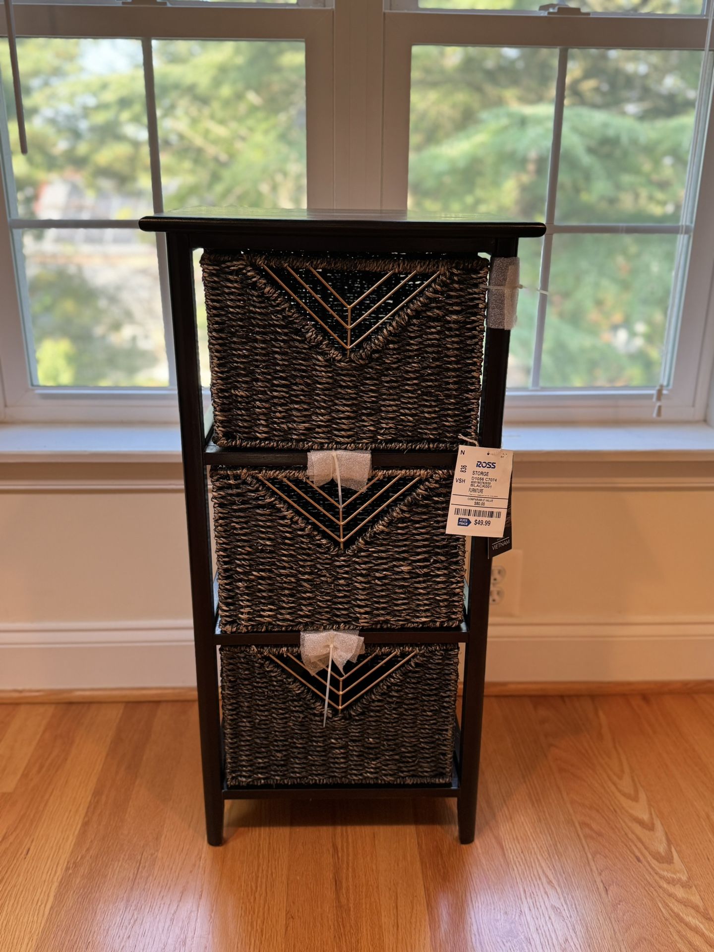 Wood and wicker tower stand with decorative drawers for storage. Never used. In excellent condition. Paid $50 for it.