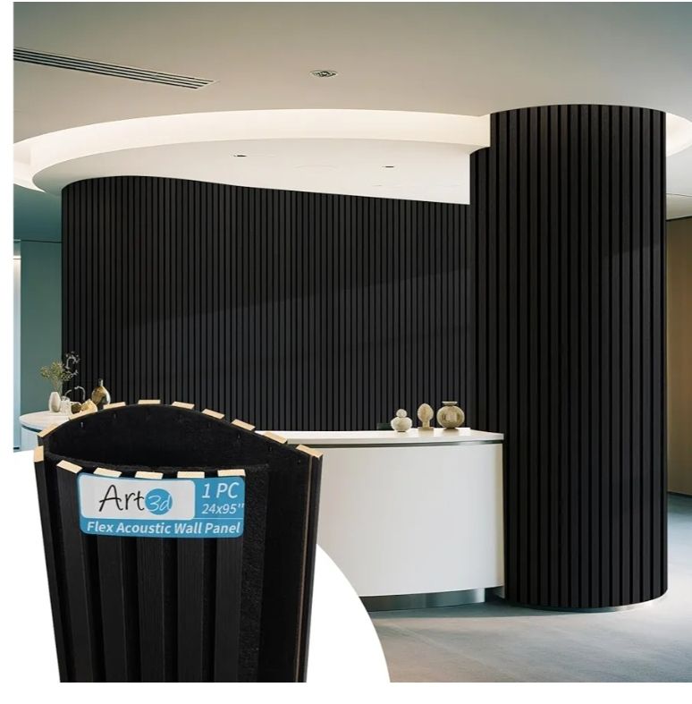 6369: New Art3d 1-Pack Acoustic Wood Slat Wall Panel with Roll-Flat Design - 95.3 x 23.8 Inch Sound Absorbing Panels for Living Room Columns Corridor Curved Wall Decor, Blackwood Material: Wood Brand: Art3d Recommended Uses For Product: Decoration Product Dimensions 95.3"L x 23.8"W Manufacturer: Art3d Premium Material - Sturdy MDF construction combined with sound-absorbing acoustic polyester felt for durability and sound reduction Roll-flat Design - Adaptable to curved and flat surfaces like columns and smooth walls, making installation more flexible and suitable for more surfaces Effortless Installation - Each package comes with acoustic wood slat wall panel and several screws. It can be trimmed to fit and fastened using screws or adhesive Modern Wall Decor - The Art3d Wood Slat Acoustic Wall Panels offer a practical and functional solution, ideal for improving acoustics while adding a modern touch of style to your living spaces Wide Application - These acoustic slat wood panels are ideal for living Room bedroom columns corridor curved walls decor and various spaces