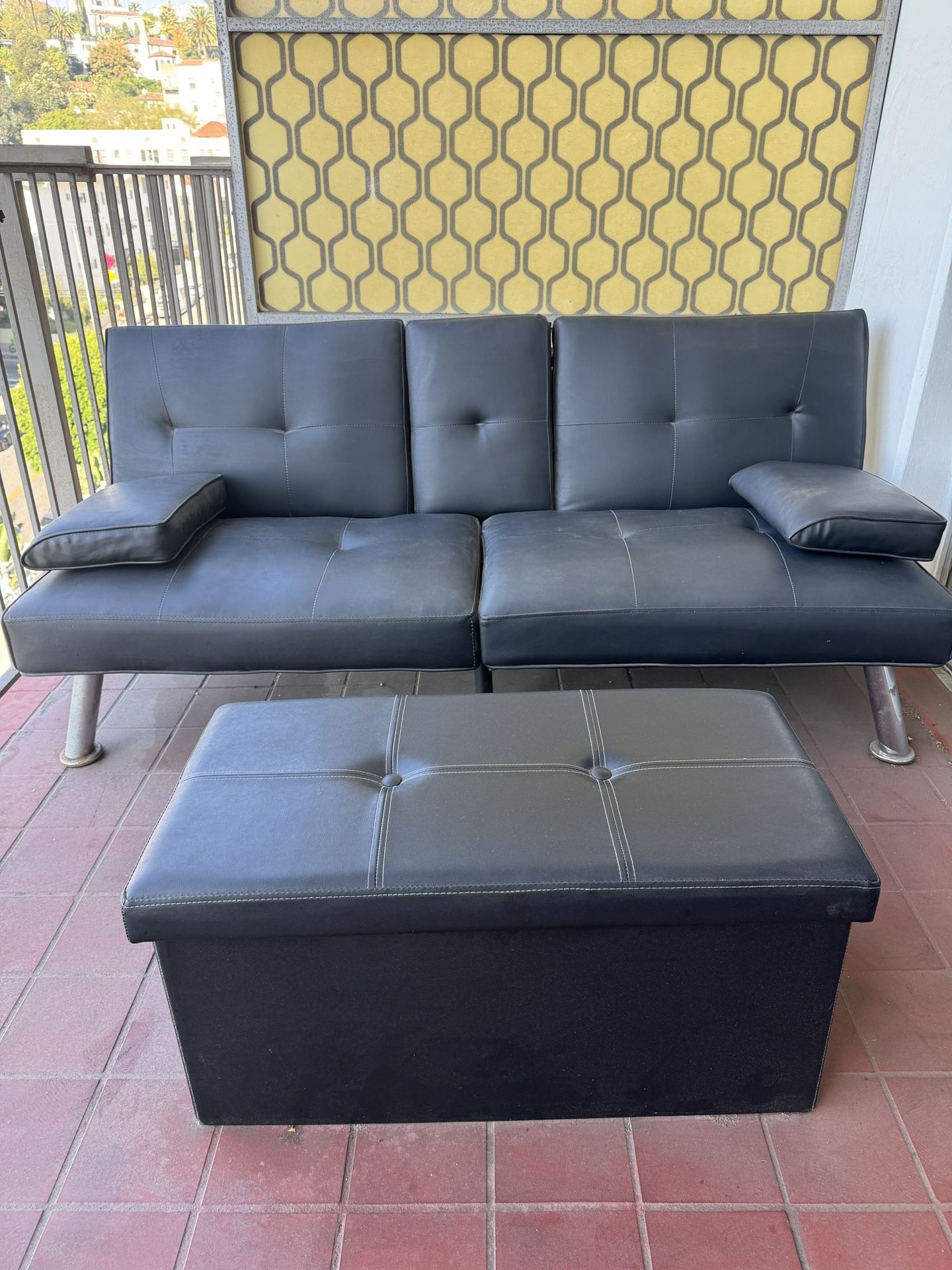 Nice small black couch with ottoman. Excellent condition and used on patio in a smoke free pet free home. Ottoman has storage inside. Couch has 2 removable arm rests and the center folds down with cup holders - great little lounging couch. No stains, tears, or rips. Happy to sell with just couch, just ottoman, or both. Priced to move ASAP, pickup only.