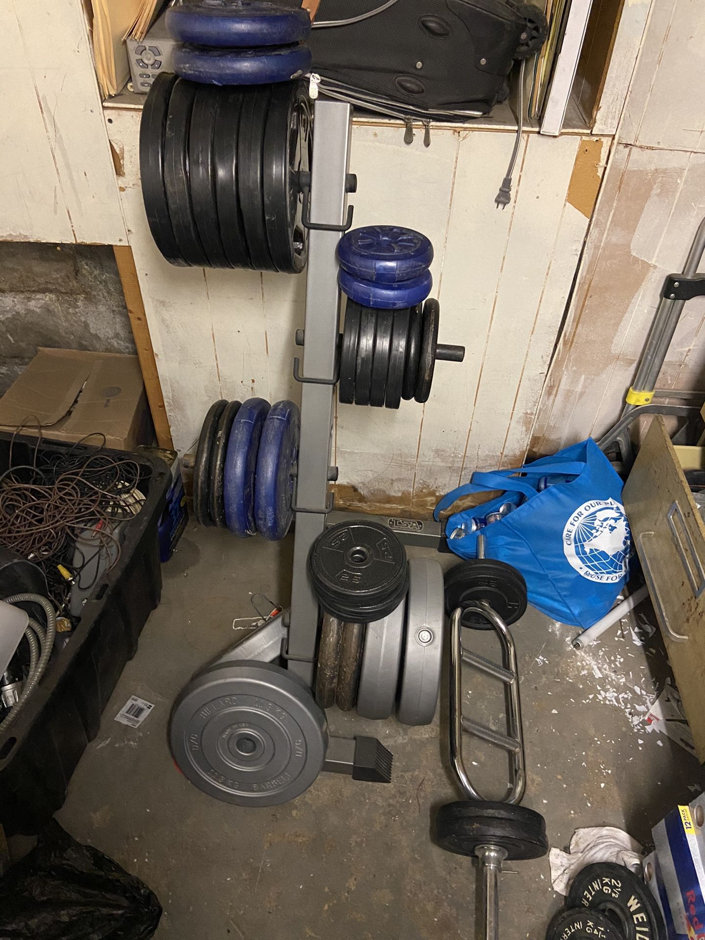 1 inch 6-25 pounds plates (1 inch) -155$ 14-10 pounds plates (1 inch) -145$ 8-5 pounds plates (1 inch) - 45$ 6-2.5 pounds plates (1 inch) 20$ Weight tree 65$ And curl bar