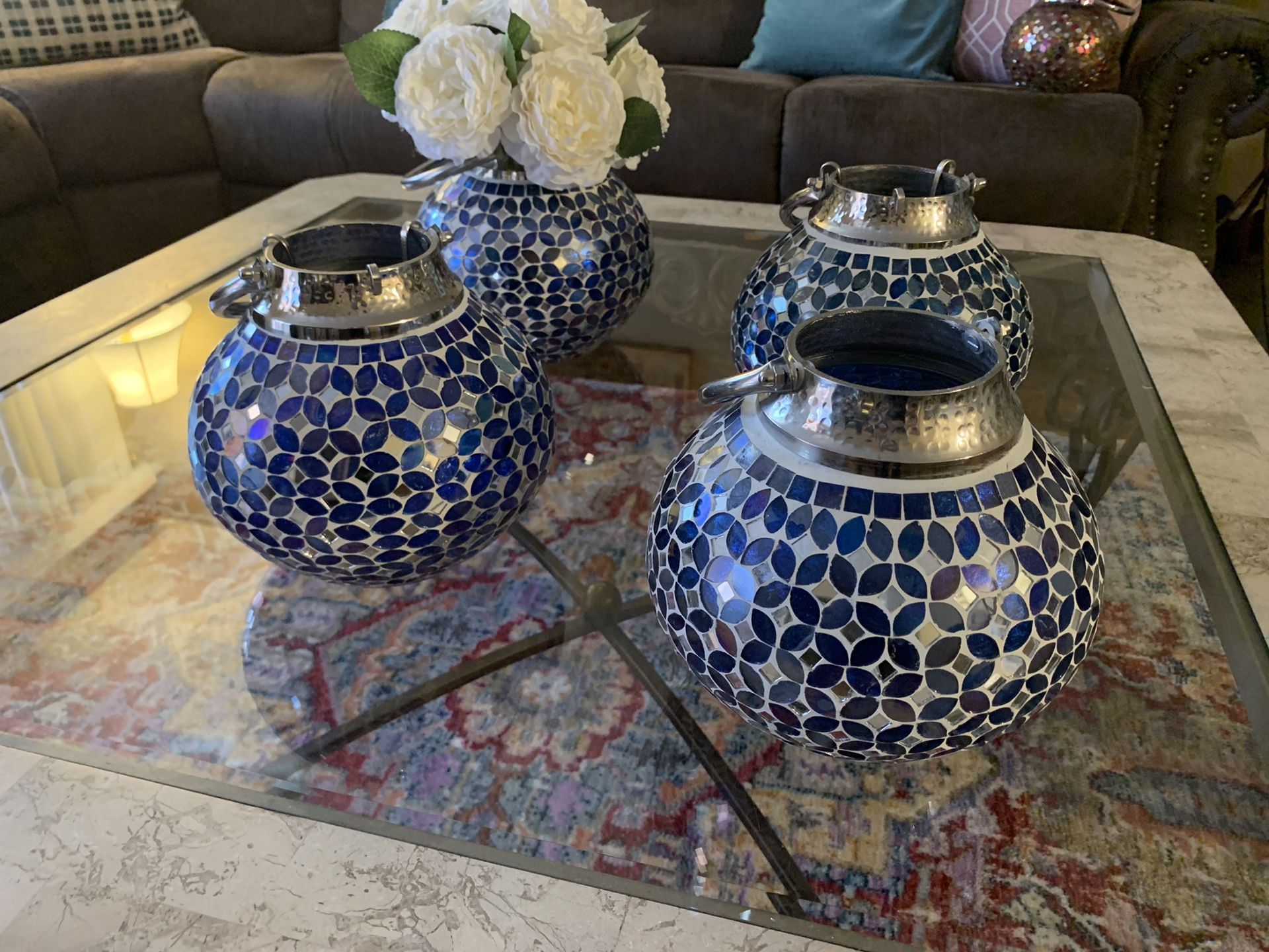 5 blue vases ✨ 1 gold vase 1 multicolored vase ✨ $$ 10 Bases decorativos se pueden usar como candelabros ho floreros todas nuevas 5 azules 1 dorada 1 combinada rojo y dorado cada una $12 dll ✨✨✨