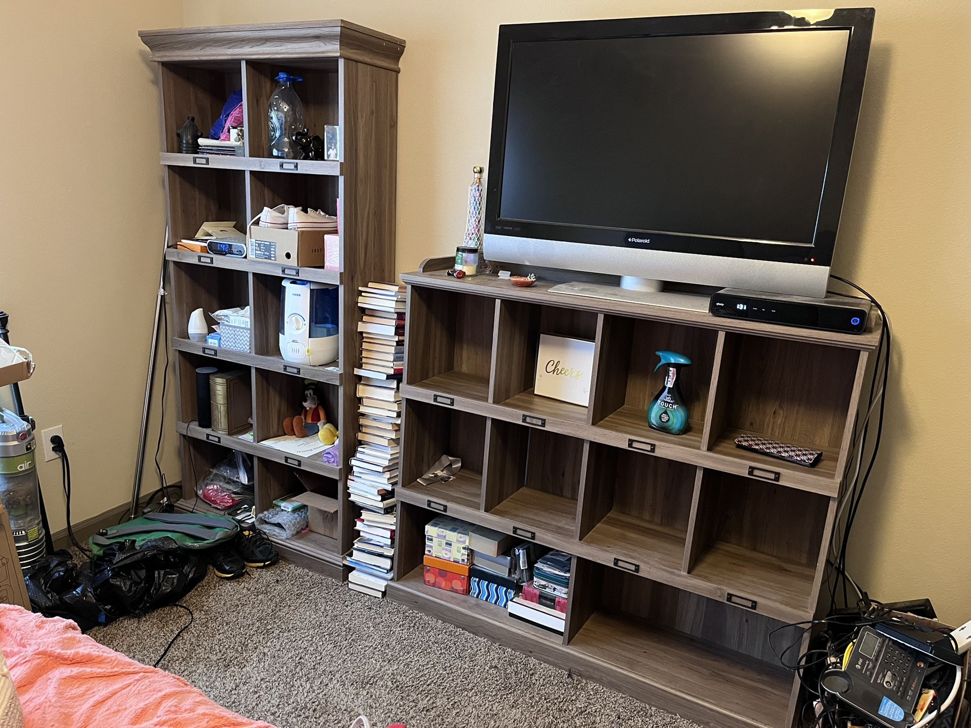 The book shelves are in perfect condition ! Just dusty ! Lol Moving by October 7th. As you can see the shelves do match, but I will split them up. $200 for both or $125 a piece. Tall shelf is 75”x33”x12” ; Small shelf is 46”x 53”x 12”