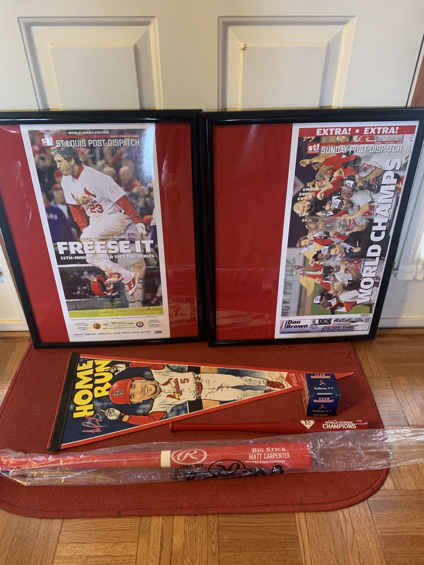 Comes with all pictured. 2 framed 2011 pictures /st Louis post dispatch , one flag banner , 2 baseball bats , one baseball. Plus free Kids medium -womens small/Xs shirt. $75 obo